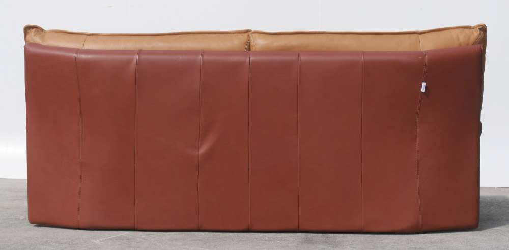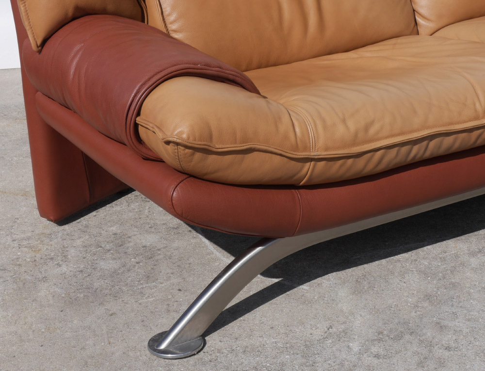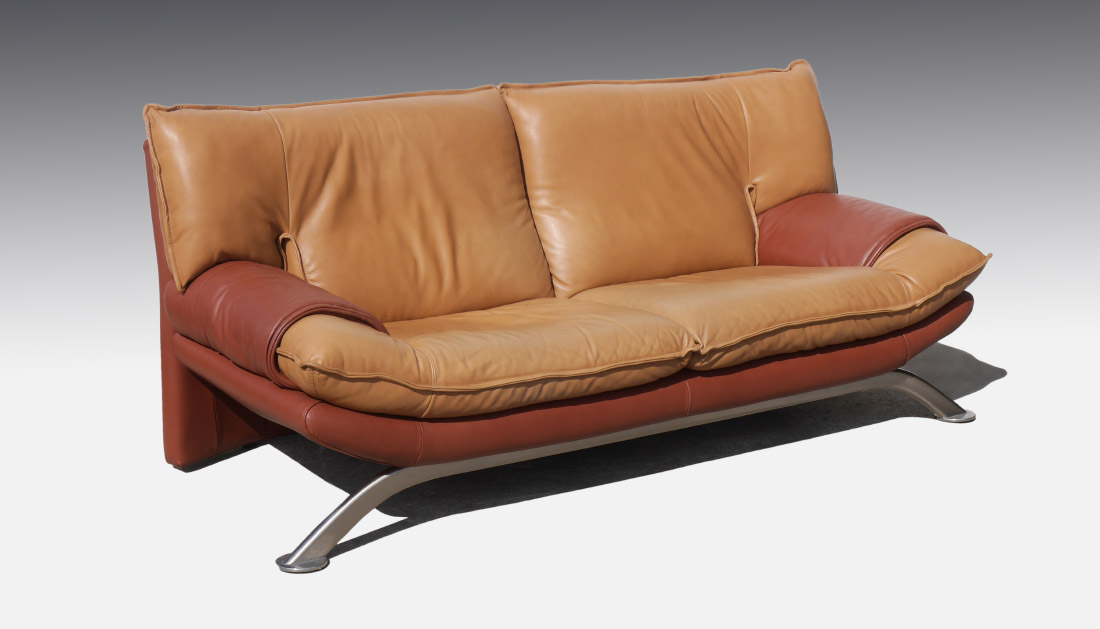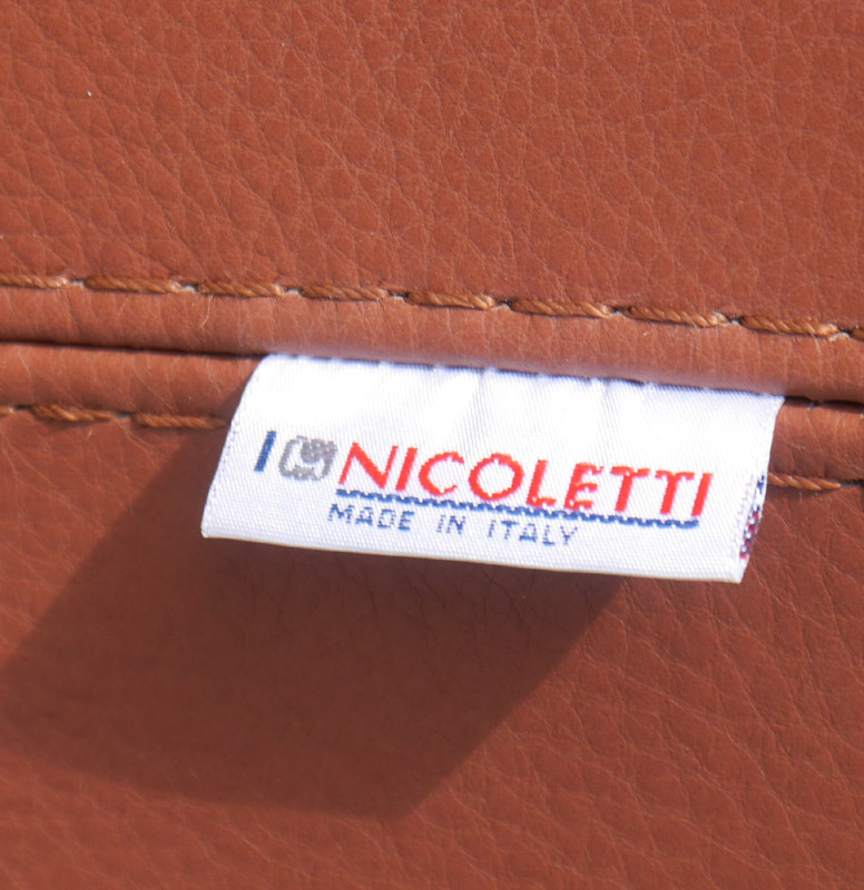 NICOLETTI ITALIAN LEATHER SOFA: Two tone leather with metal legs and support across the front. Measures approx. 78'' long x 35'' high x 32'' deep. Nicoletti label.