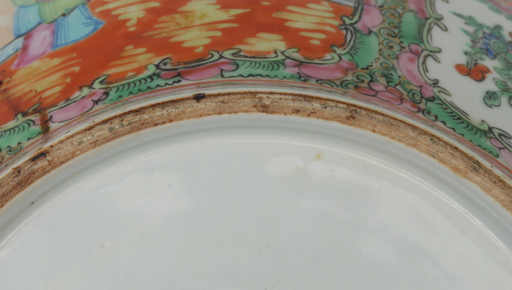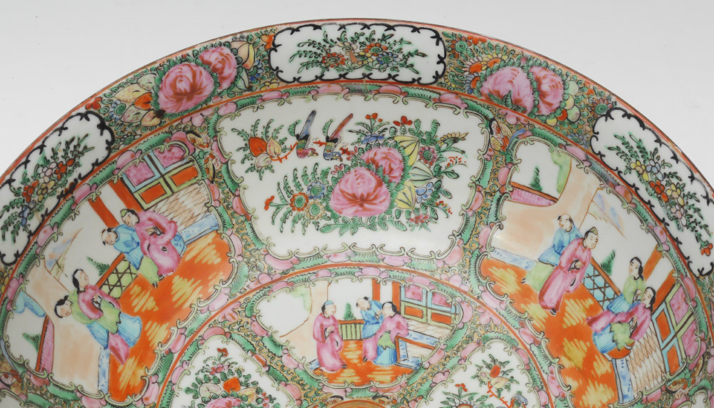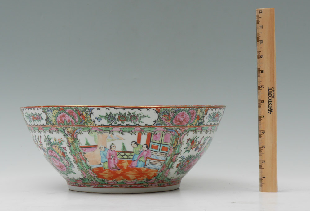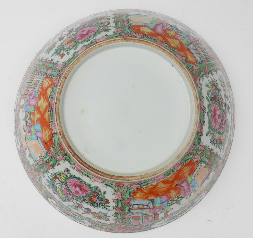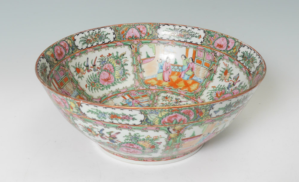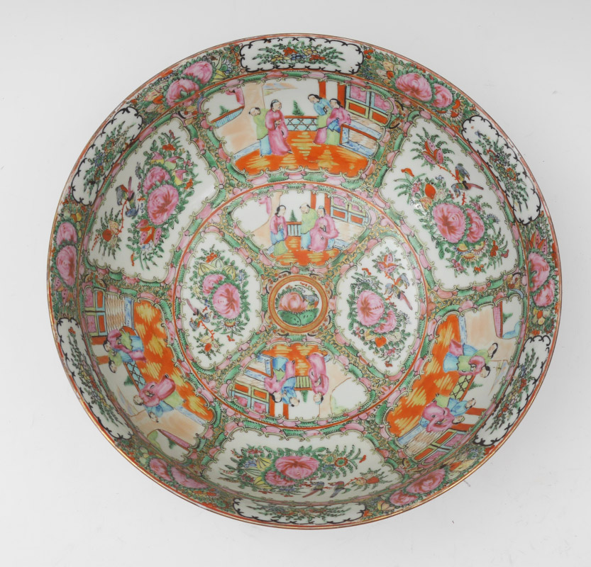 CHINESE ROSE MEDALLION PUNCH BOWL: Interior and exterior decorated with genre scenes in reserves, floral borders, unmarked, 5 3/4'' h. x 14 1/4'' dia.