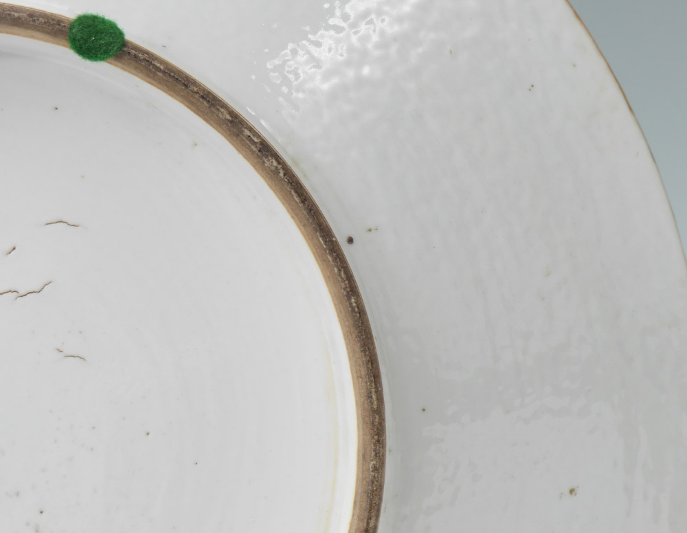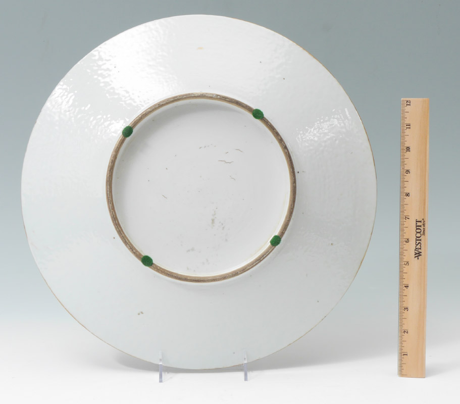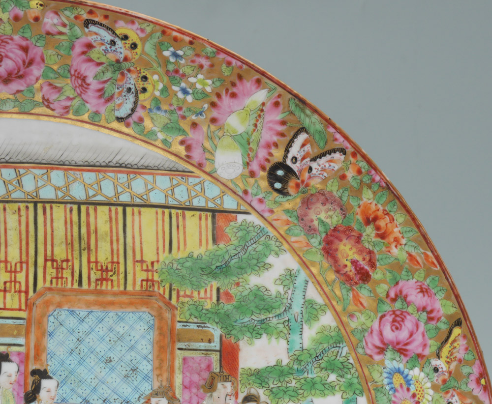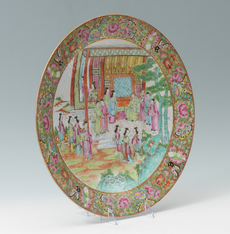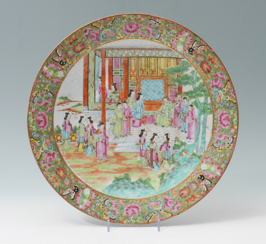 LARGE CHINESE MANDARIN ROSE CHARGER: Floral motif rim border with butterflies. Central medallion with outdoor genre scene of royalty with attendants, unmarked, overall measures 2 1/2'' h. x 16''.