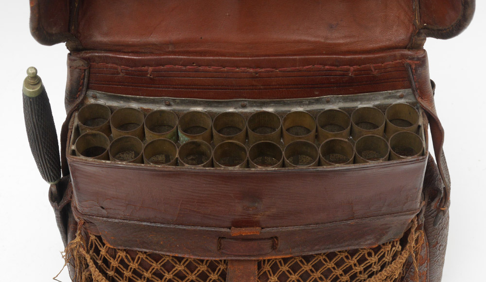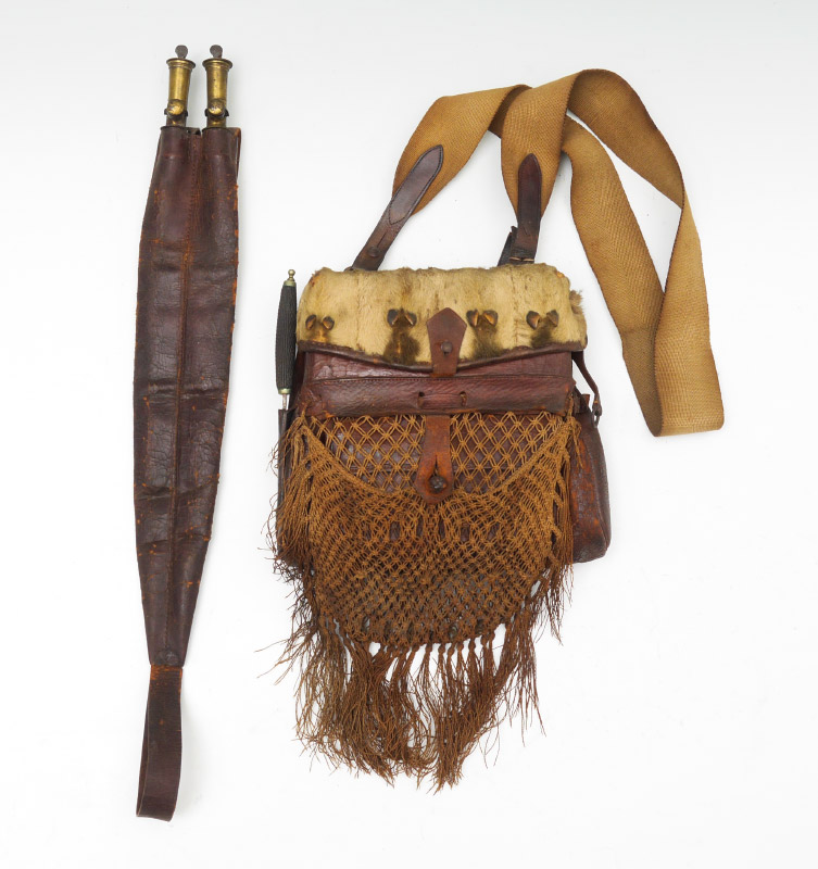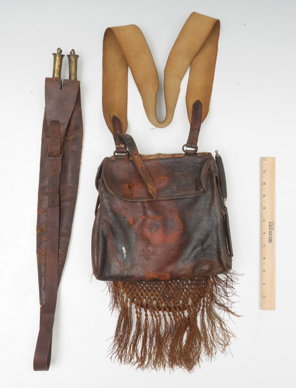 LEATHER CARTRIDGE BAG & POWDER FLASK: 2 pieces total to include 1) Leather shoulder bag with deerskin lift top, 20 tube cartridge insert, woven string bag front, 2 compartment, small knife on side. Canvas strap, overall measures 9 1/2'' h. x 11 1/2'' x 3 1/2''. 2) Leather shoulder double powder flask, brass measures, flask length 20'' excluding strap.