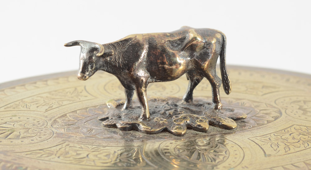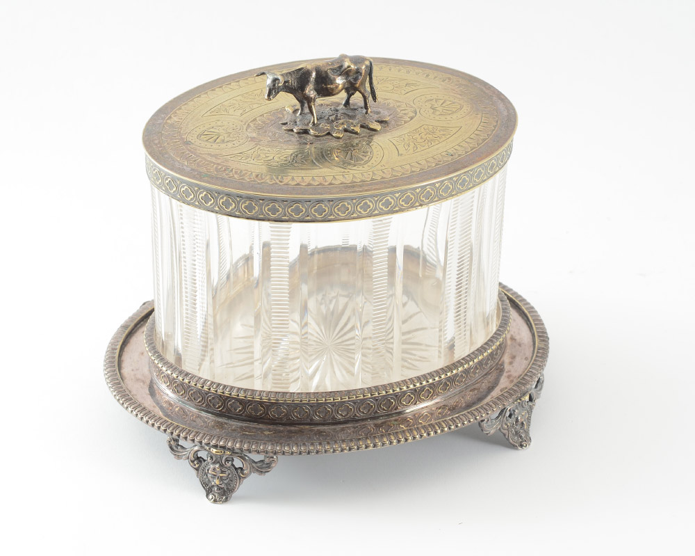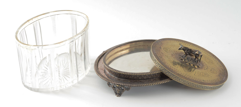VICTORIAN SILVERPLATE & CUT GLASS TEA CADDY: Engraved lid with unique full figure cow finial, oval cut glass body, base with 4 feet. No visible makers mark, overall measures 7'' h. x 8 1/4'' x 6 1/4''.