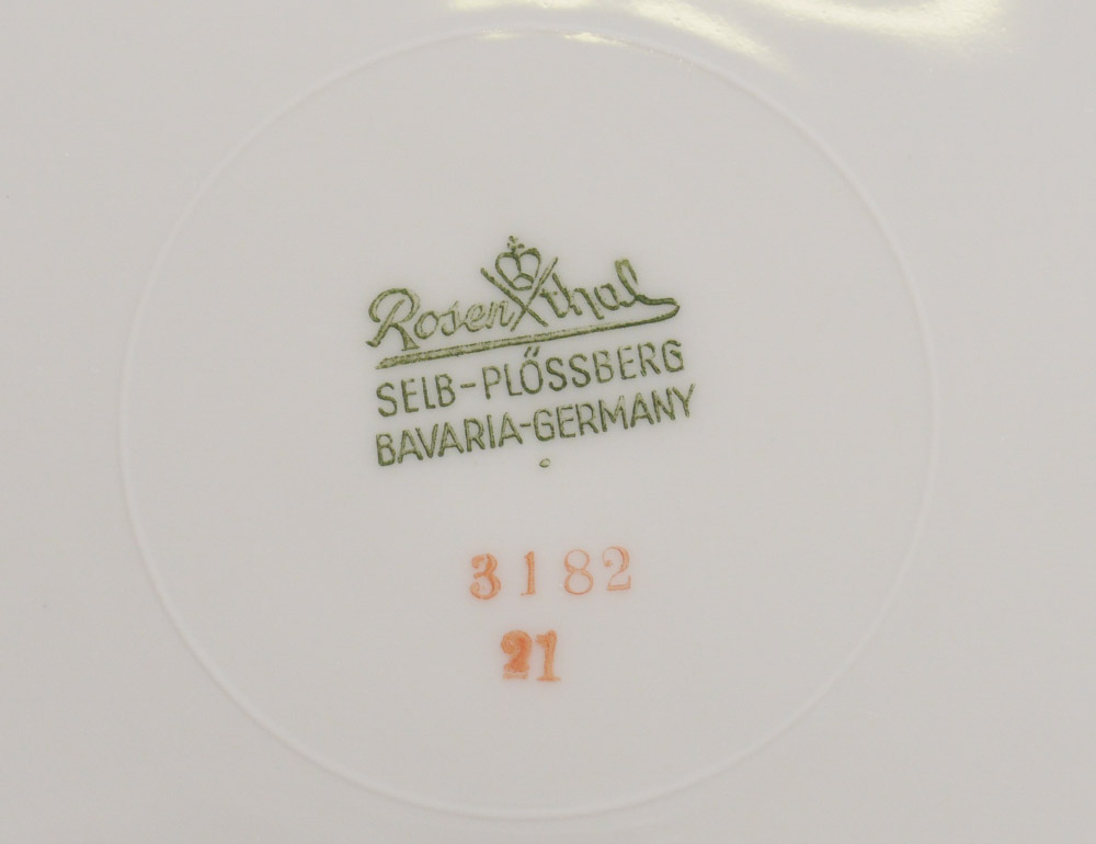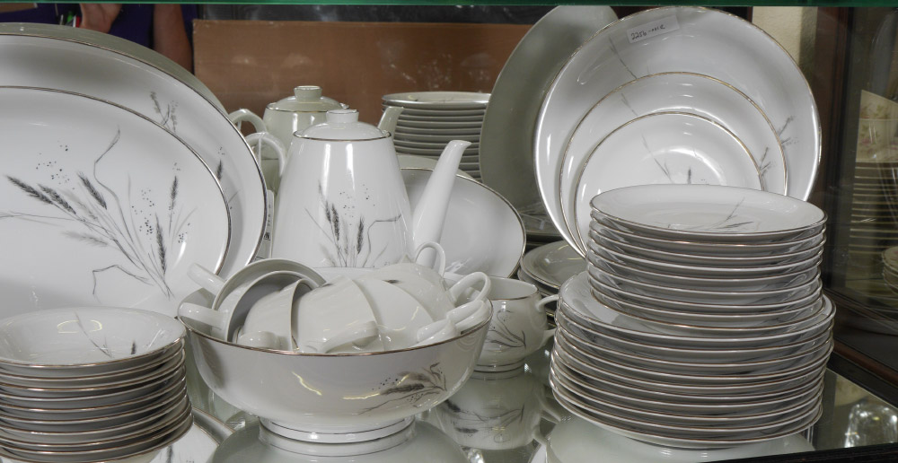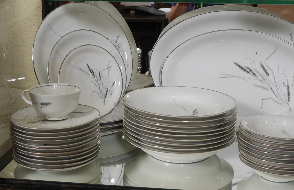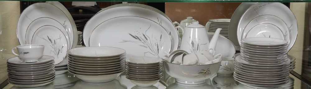 ROSENTHAL FINE CHINA IN A SILVER AND GRAY WHEAT PATTERN: Approx. 7 dinner plates (9 1/2''), 12 salad plates, 11 bread plates, 9 soup bowls, 9 dessert bowls, 9 cups, 11 saucers, open vegetable bowl, relish, 2 platters (13 and 15''), and a coffee pot.