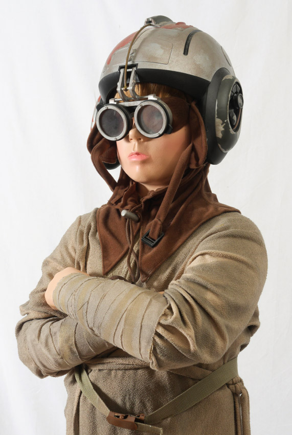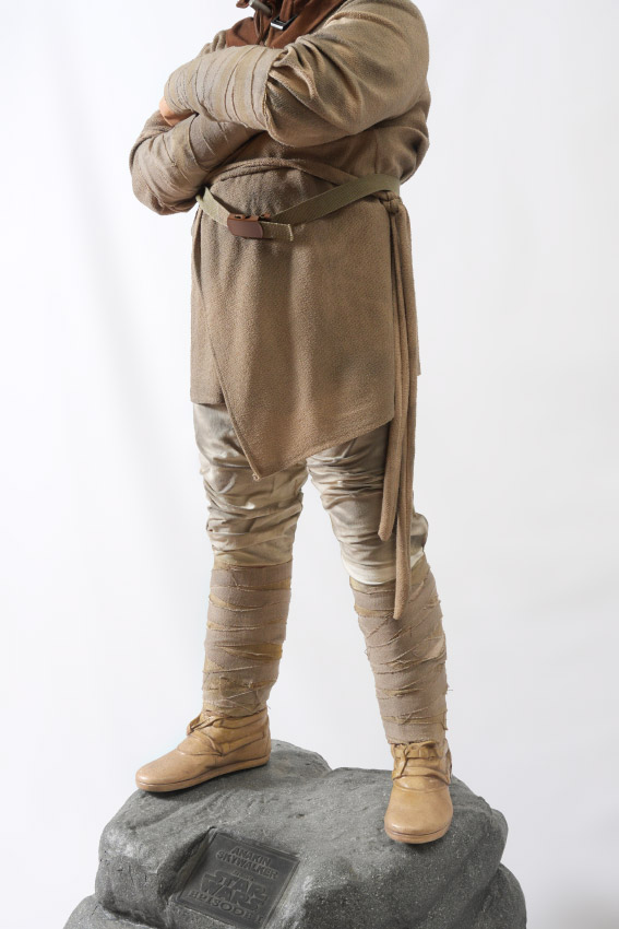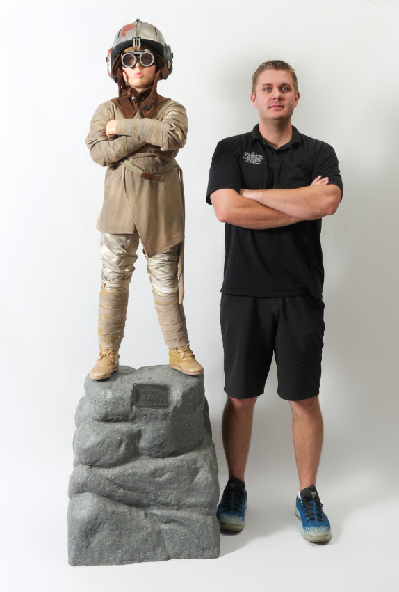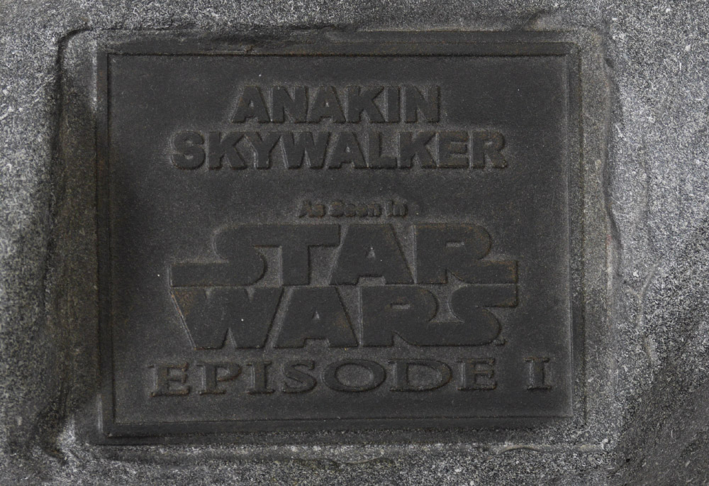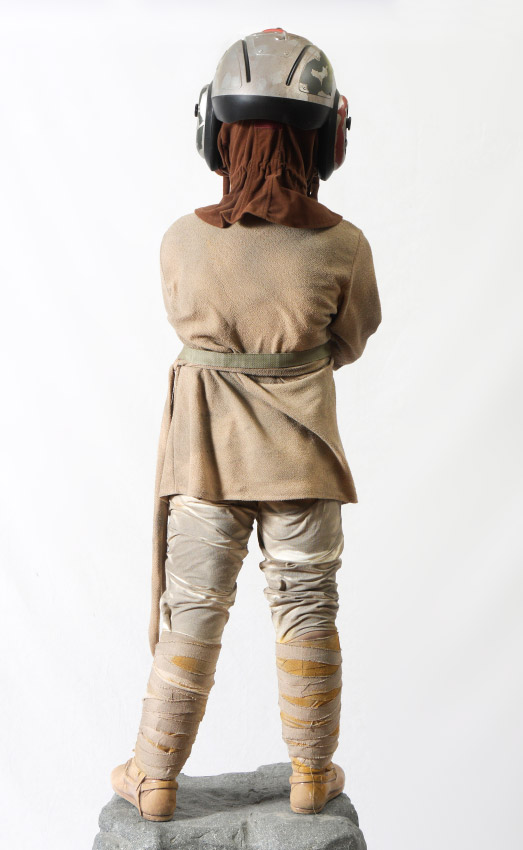 LIFE SIZE STAR WARS ANAKIN SKYWALKER FIGURE: Full figure of Anakin Skywalker from Star Wars Episode 1 in his pod racing outfit. Standing on plastic rock with plaque. Overall measures 77'' h. x 22'' x 22''.