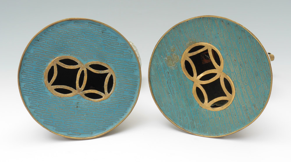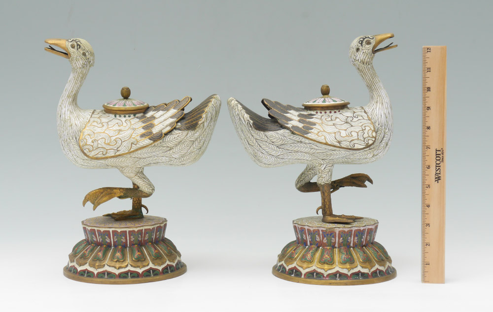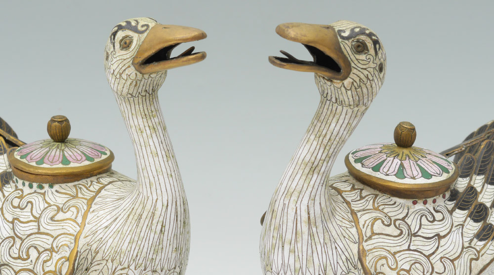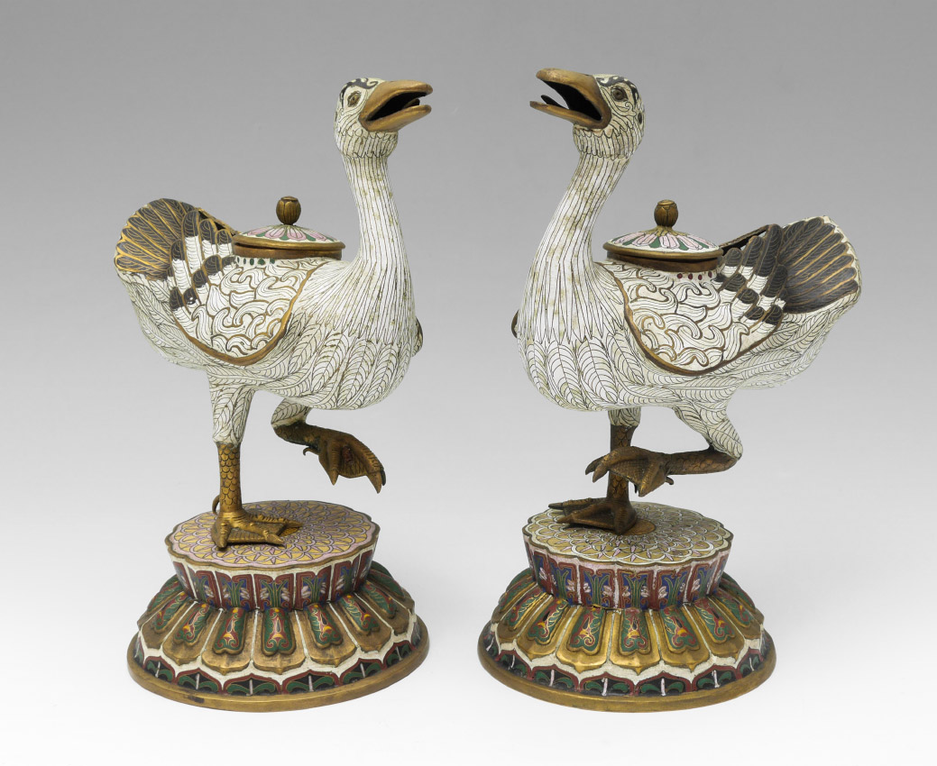 PAIR OF CLOISONNE FIGURAL BIRD INCENSE BURNERS: Black and white figural birds with lid on back, polychrome decorated base. Each overall measures approx. 13'' h. x 9 1/2''.