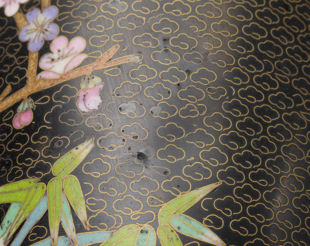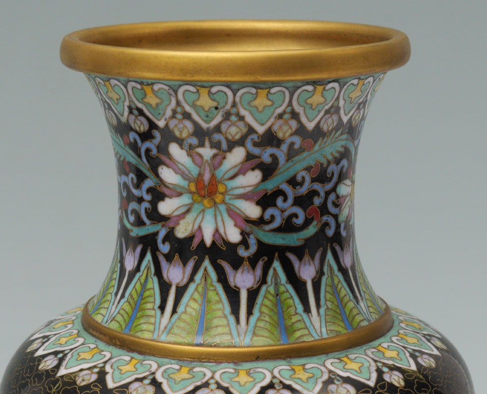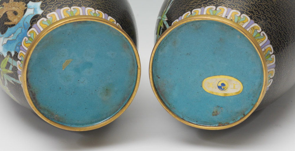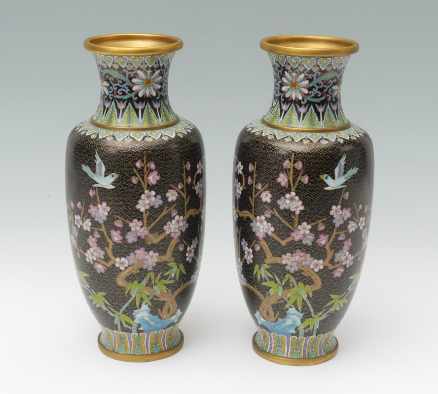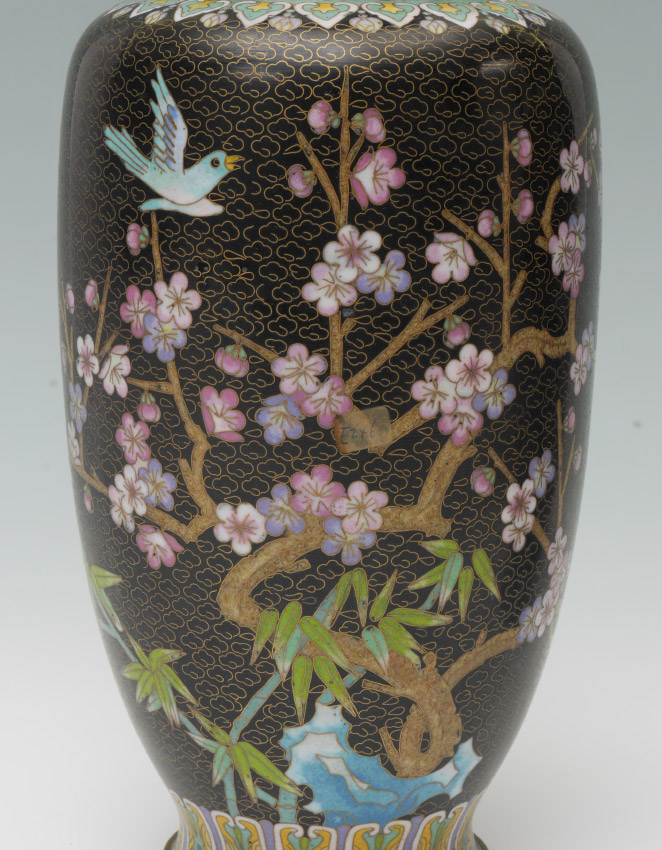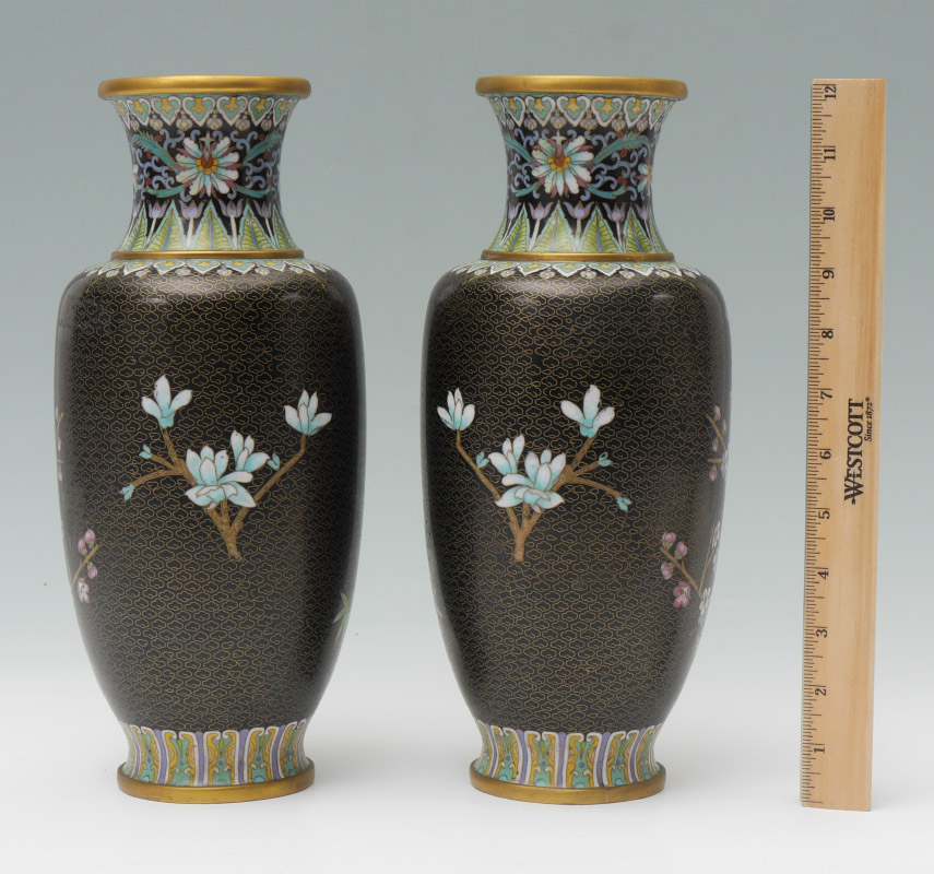 PAIR OF BLACK CLOISONNE BALUSTER FORM VASES: Nicely detailed with floral and bird decoration, unknown makers foil label on base of one. Overall 12 1/4'' h. x 5''.