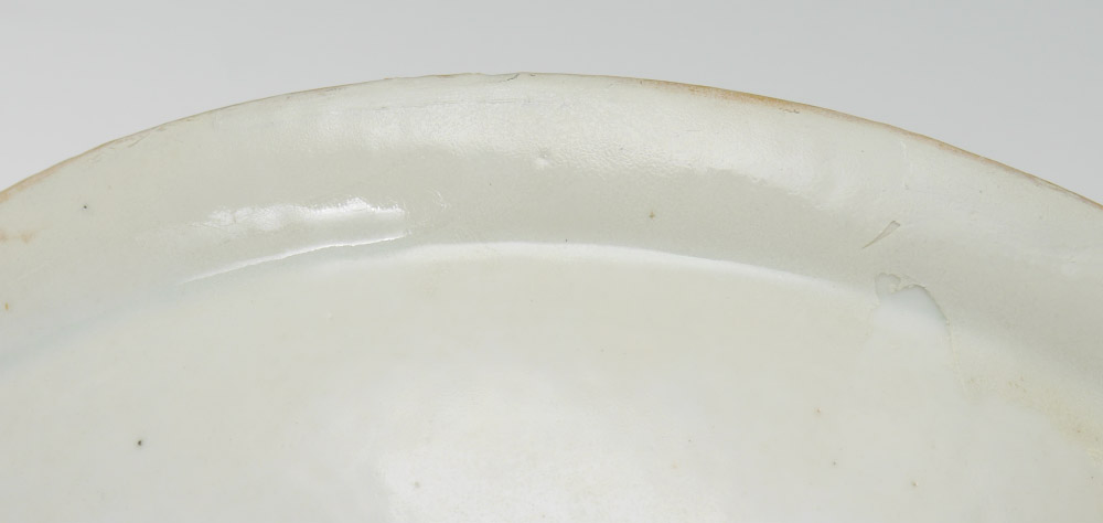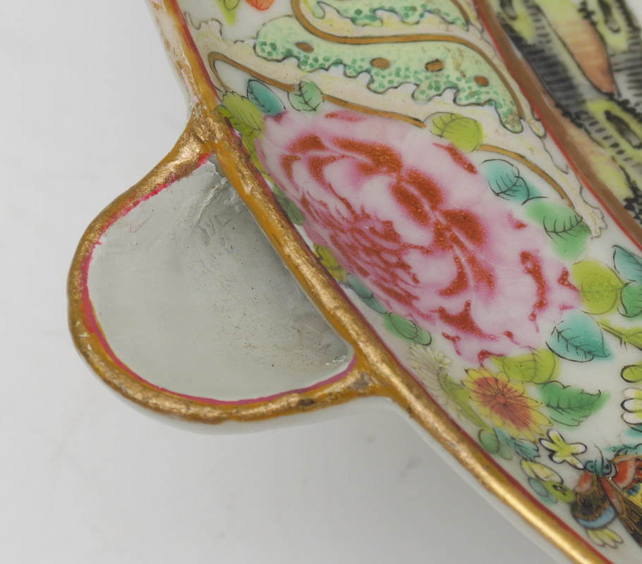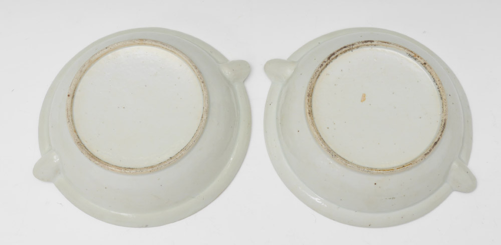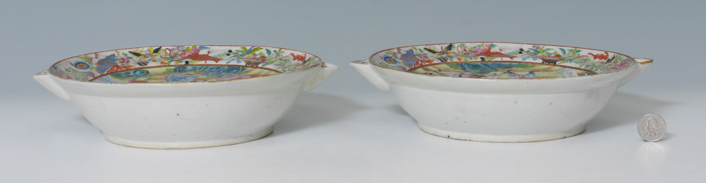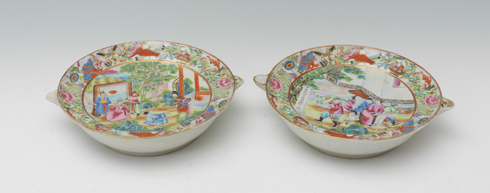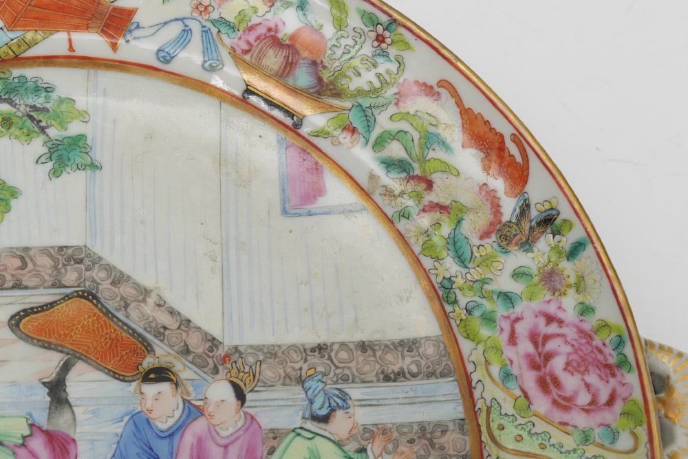 2 CHINESE MANDARIN ROSE WARMING PLATES: 2 pieces total, both unsigned, to include 1) Center scene of artist and students, 2 1/2'' h. x 10 3/4''. 2) Center scene with jovial pranksters, 2 1/2'' h. x 10 3/4''.