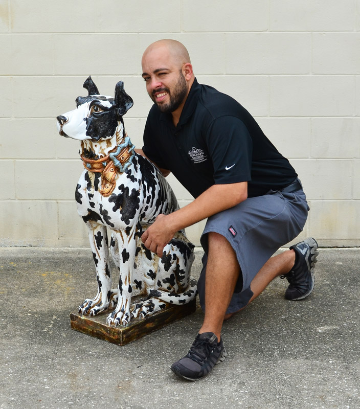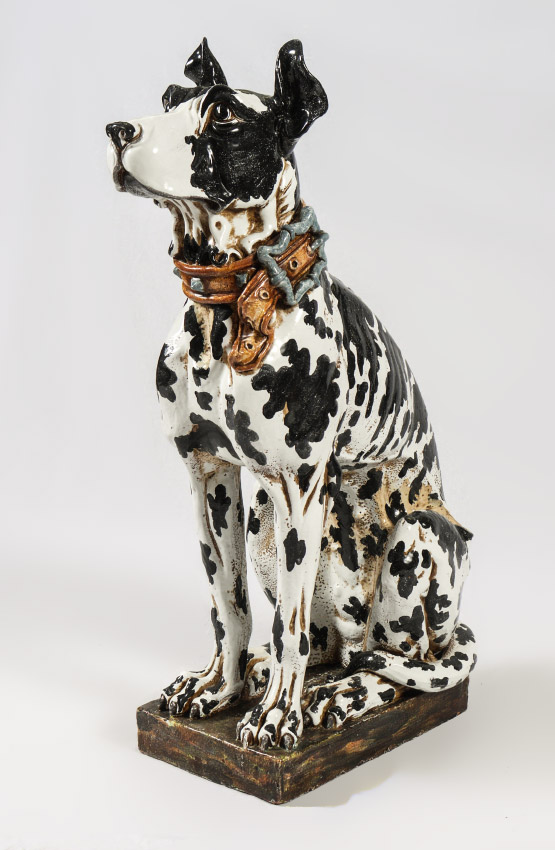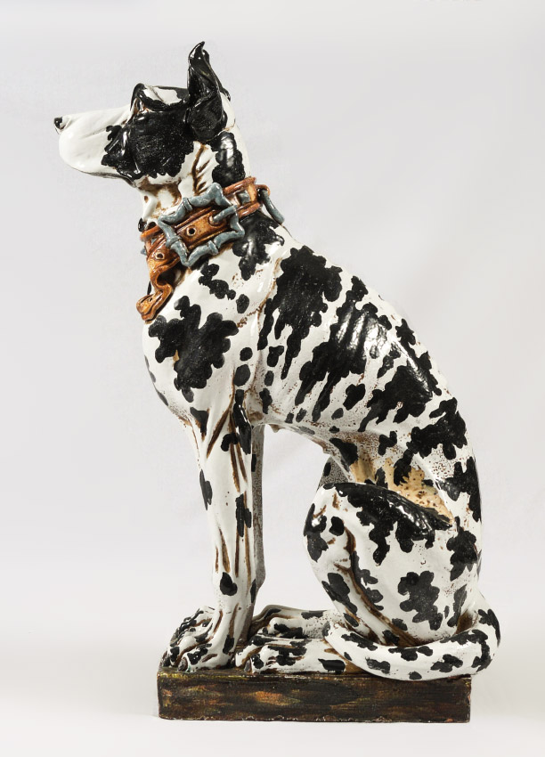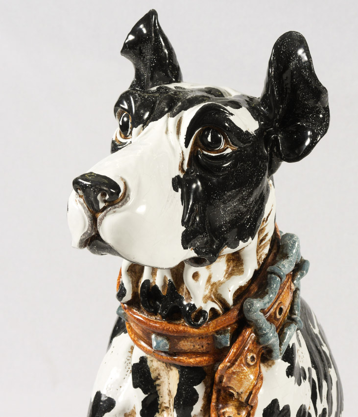 LIFE SIZE CERAMIC HARLEQUIN GREAT DANE DOG: Nicely detail figure of a seated Great Dane, 40'' h. x 13 1/4'' h. x 26''.