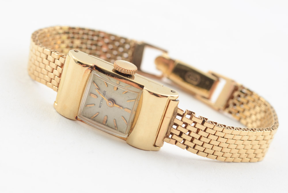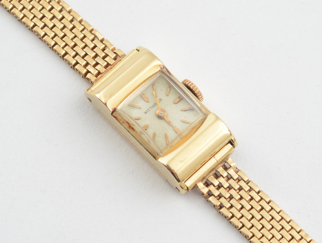 WITTNAUER 14K GOLD LADIES WRIST WATCH: 14k gold case with square crystal, 14k gold mesh weave watch band. 7 1/2'' long overall, approx. 19.6 grams total inclusive.