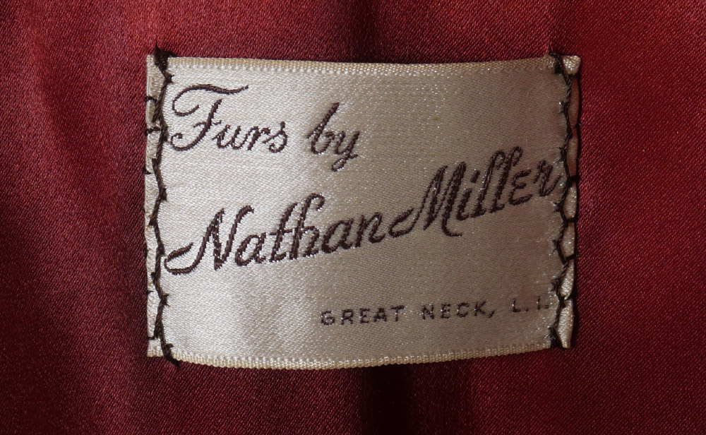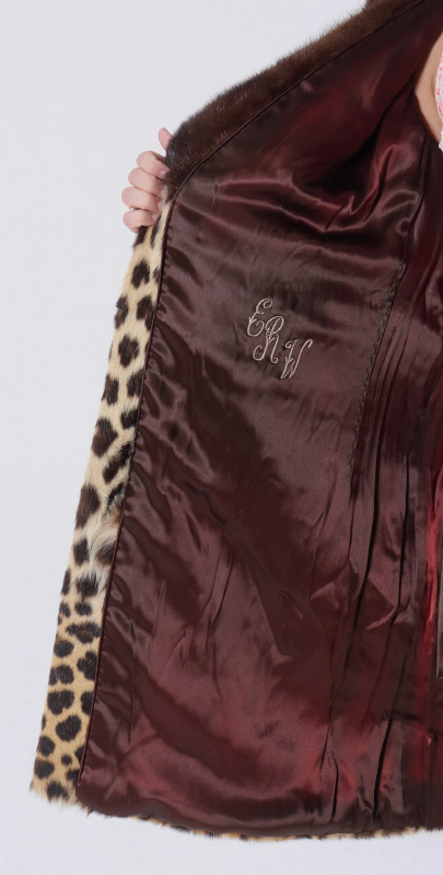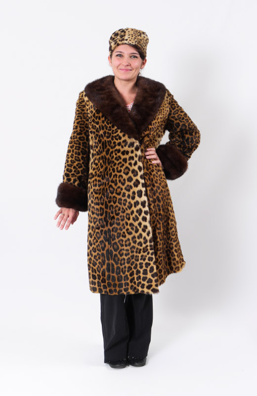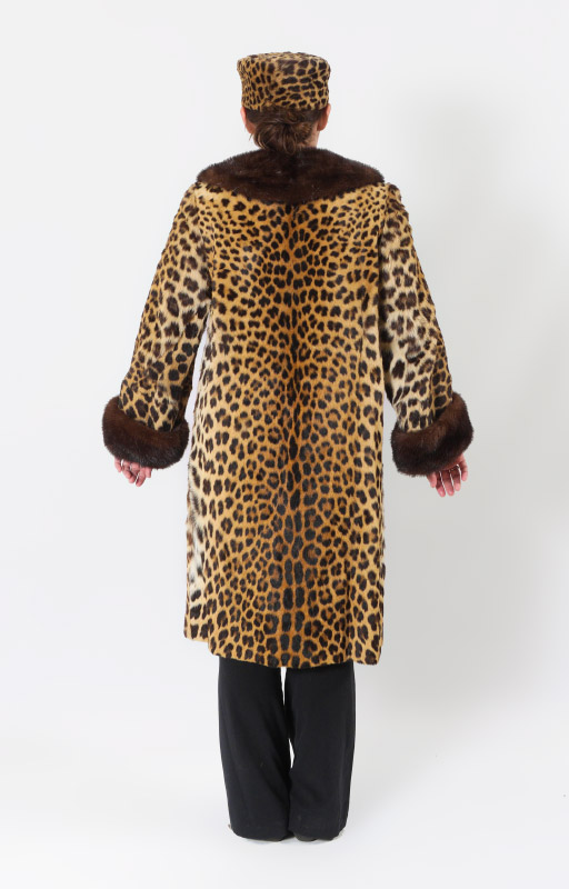VINTAGE SPOTTED CAT FUR COAT WITH PILL BOX HAT: With mink lapel collar and cuffs. Nathan Miller label. Measures approx. 41'' collar to hem, 17 shoulder to shoulder and 23'' shoulder to cuff.