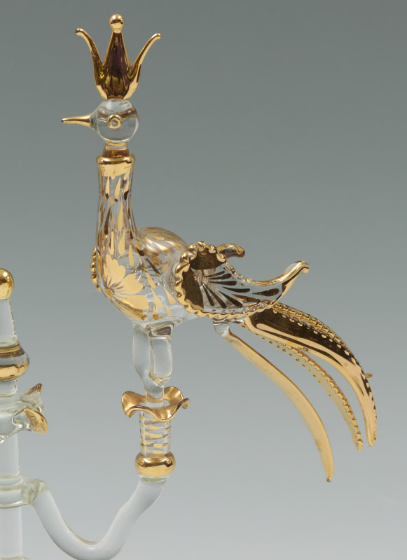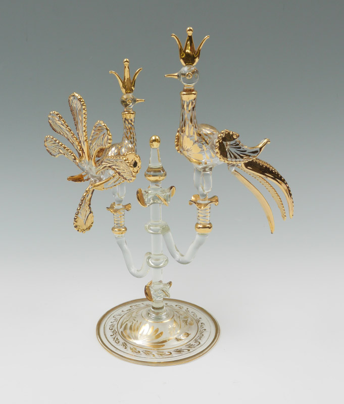 ELABORATE GLASS PERFUME WITH FIGURAL STOPPERS: A most unusual gilt decorated glass double perfume with figural peacock stoppers. Overall measures 14'' h. x 9 3/4'' x 5 3/4''.