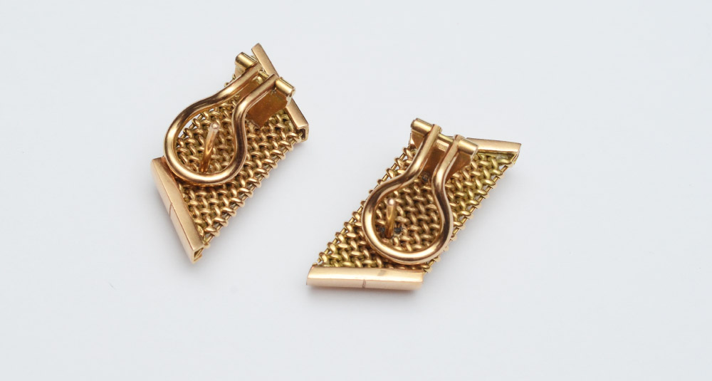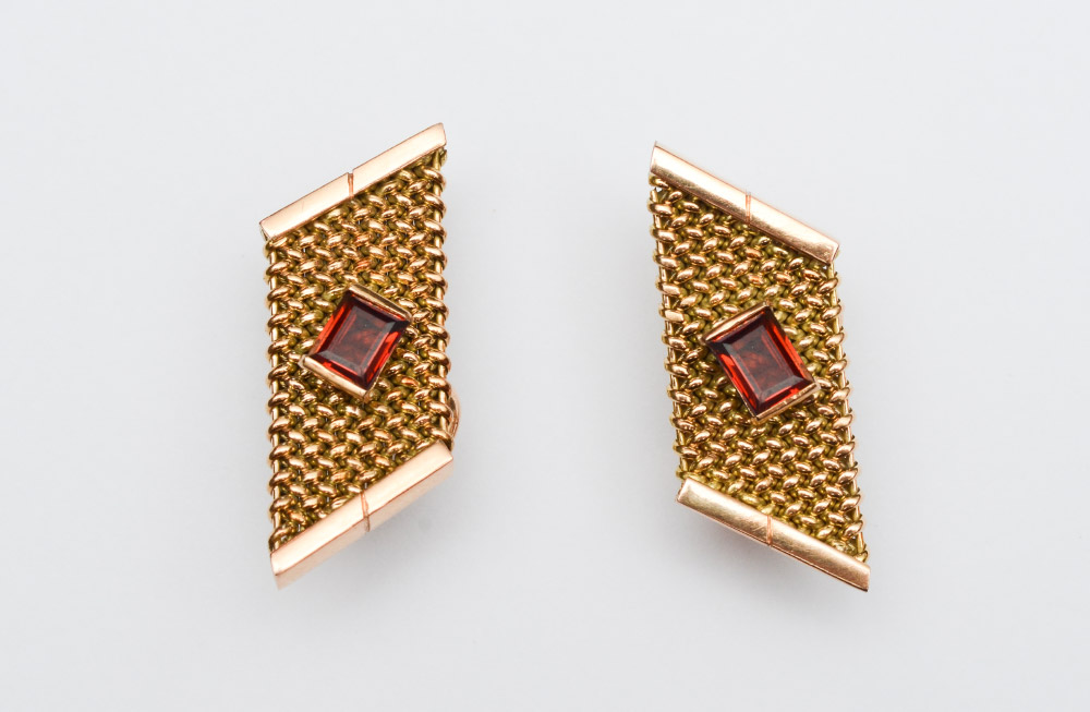 14K GARNET EARRINGS: 14K yellow gold cufflinks contain 2 emerald cut garnets. Weight: 1.00 Ct. Approx. The garnets are prong set. Post and hinged clip closures. Weight : 10.5 grams.