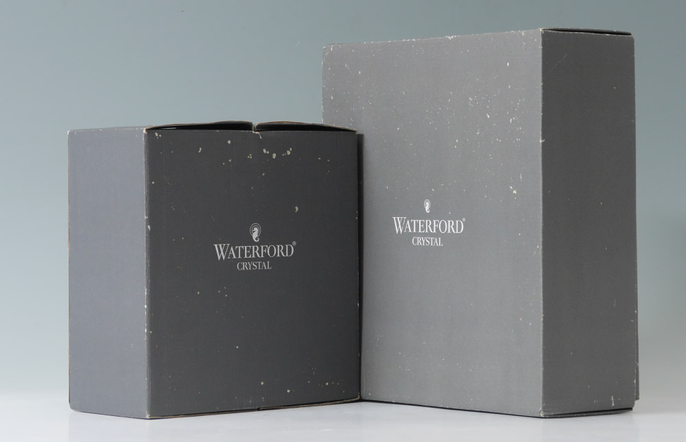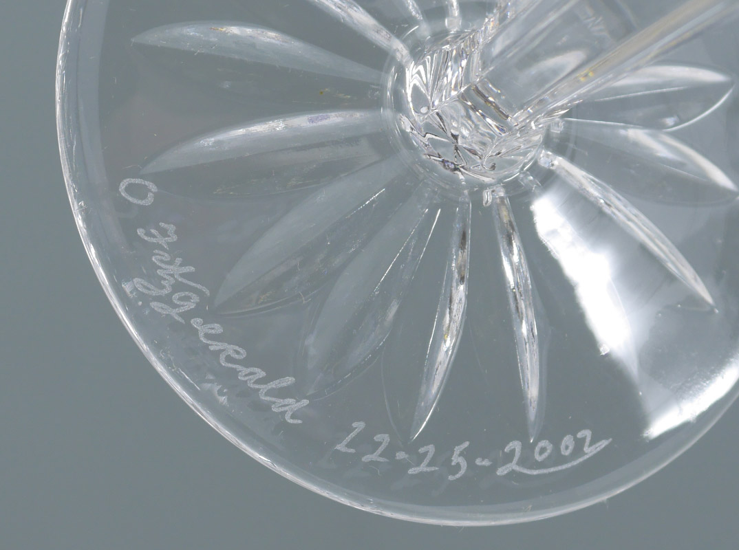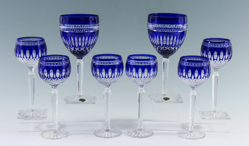WATERFORD CRYSTAL SAPPHIRE SERENITY AND COBALT CLARENDON: 8 piece group to include 6 cobalt Clarendon wine hocks (8''), and 2 Sapphire Serenity water goblets (8 3/4''). The goblets are artist signed Fitzgerald and in the box.