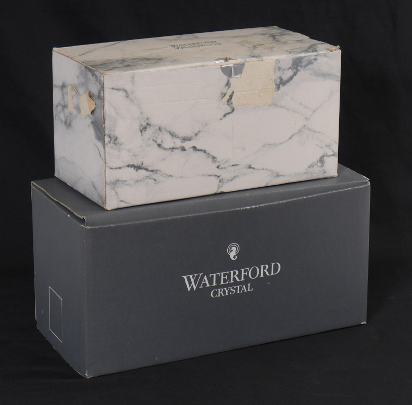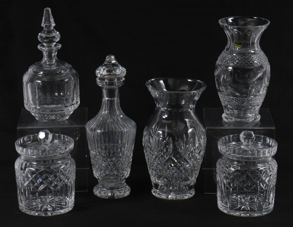 WATERFORD CRYSTAL 6 PIECE GROUP: To include, 10'' Killarney Vase in box, 2 decanters (10 & 12''), a 9'' vase and 2 biscuit jars.