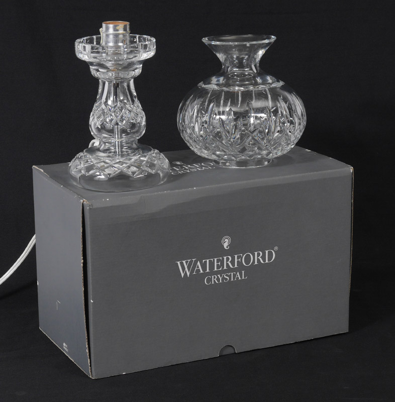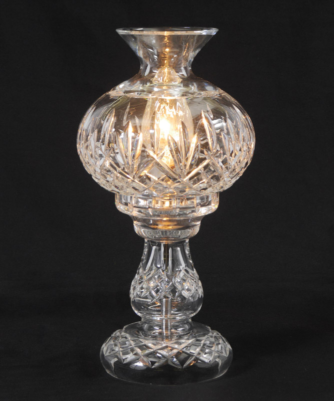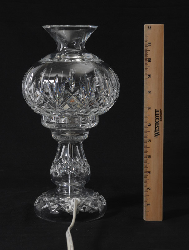 WATERFORD CRYSTAL LAMP: Oil lamp style with crystal base and shade, 12'' high. Sold in the original box.