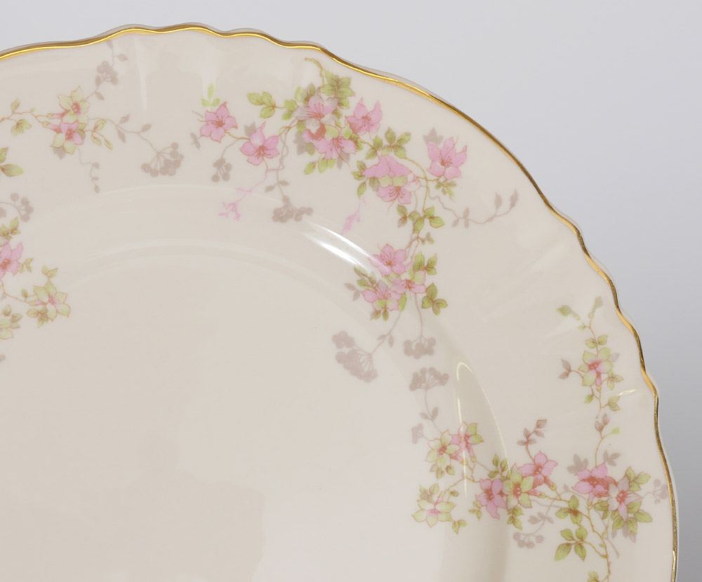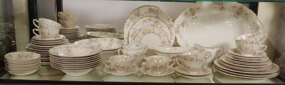 SYRACUSE FINE CHINA SERVICE FOR 8 IN THE STANSBURY PATTERN: Approx. 55 pieces to include 8 each of dinner plates (10''), 8 salad plates (8''), bread plates, soup bowls, dessert bowls, cups and saucers. Also 3 open vegetable bowls, gravy, creamer and sugar.