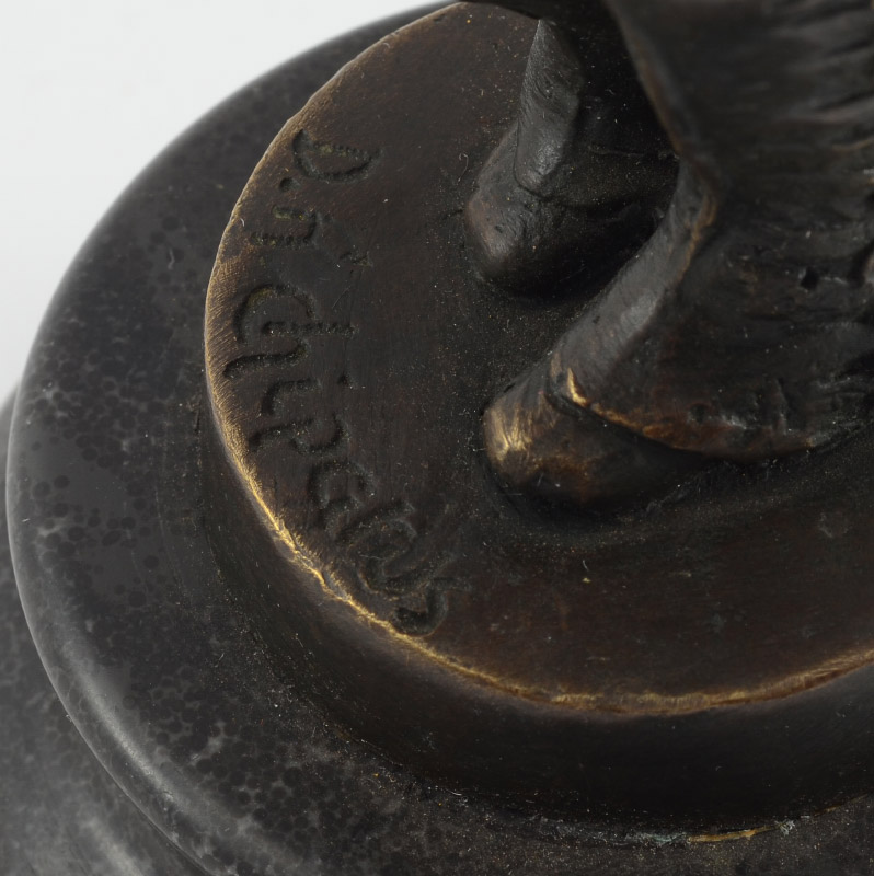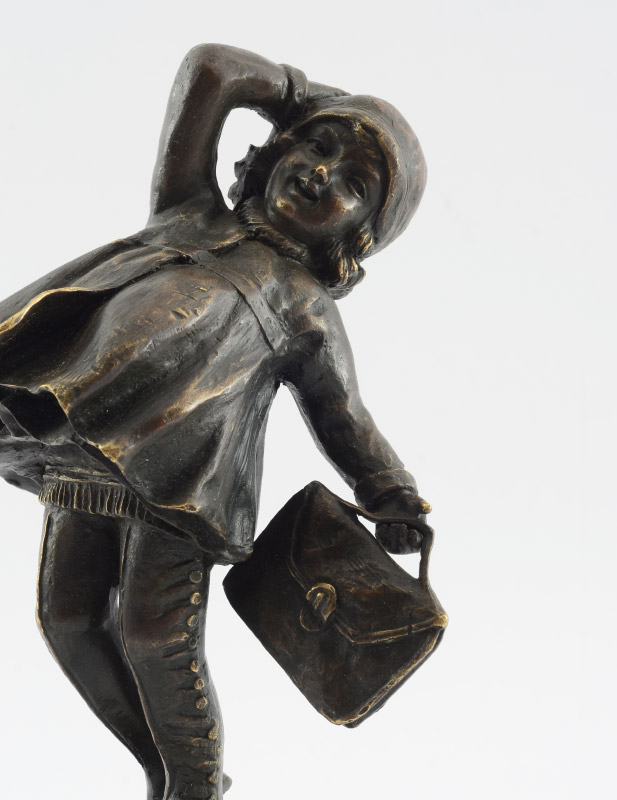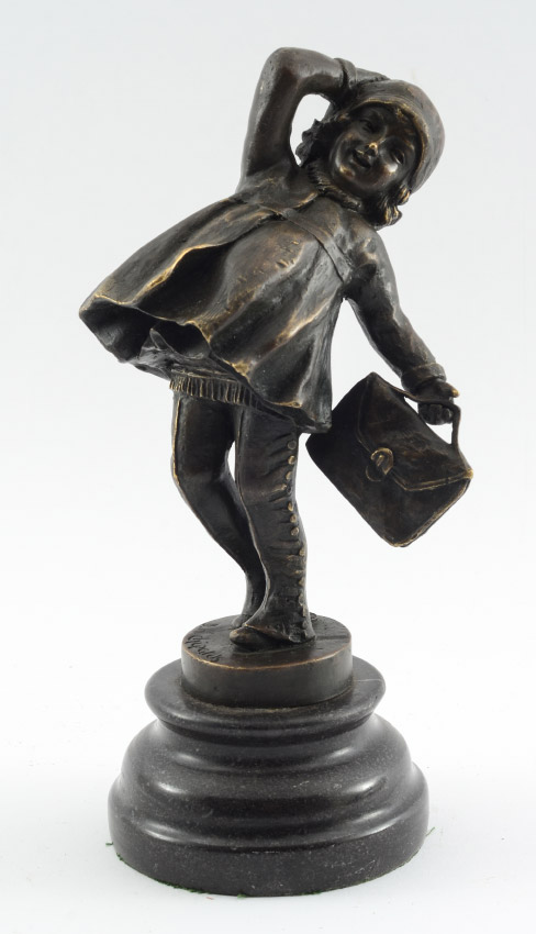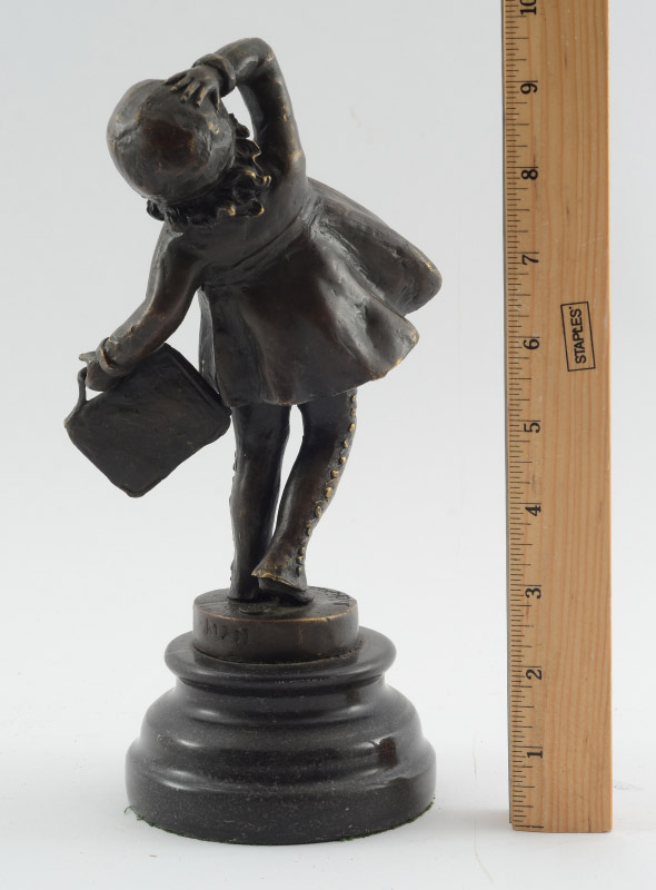 BRONZE OF YOUNG GIRL AFTER CHIPARUS: Young girl holding purse in a heavy wind, measures 7'' h., there is a signature on the base with the founders mark, affixed to a stepped marble plinth, measures 9'' h. overall.