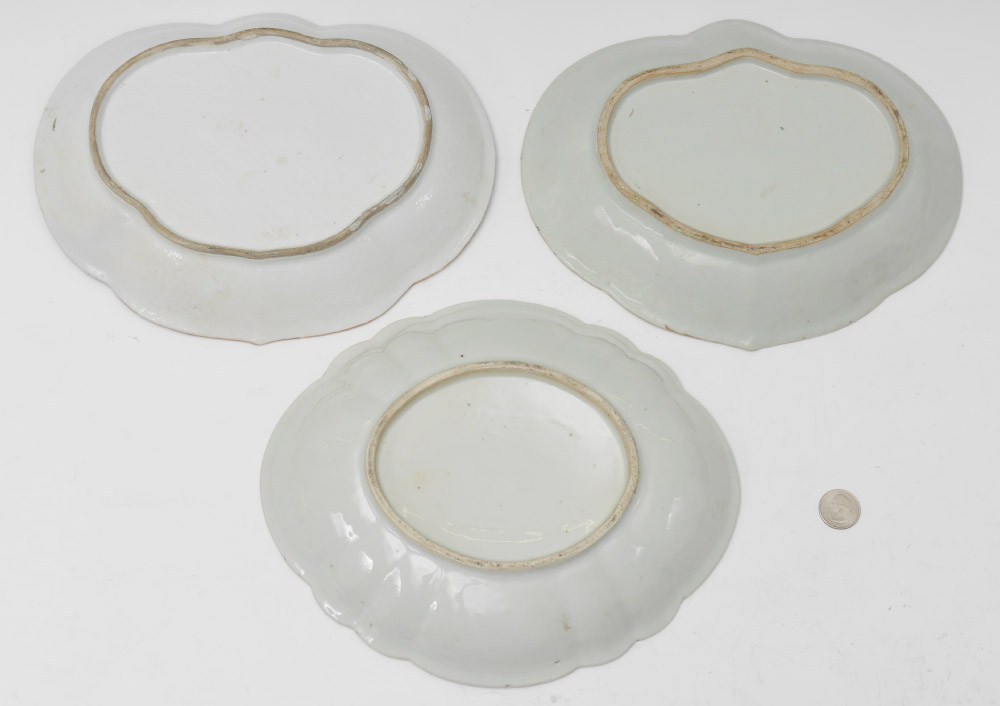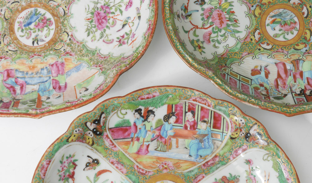 3 CHINESE ROSE MEDALLION SERVING TRAY: 3 shallow tray, each with typical genre scenes and floral motifs in reserves, 2 of a similar shape rim, the third more rounded rim. Unmarked, largest measures 1 3/4'' h. x 11'' x 9''.