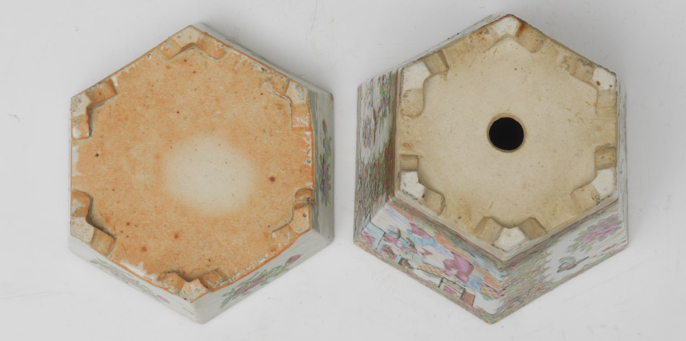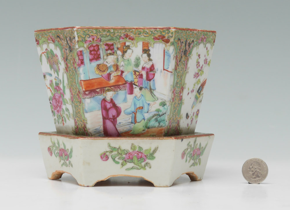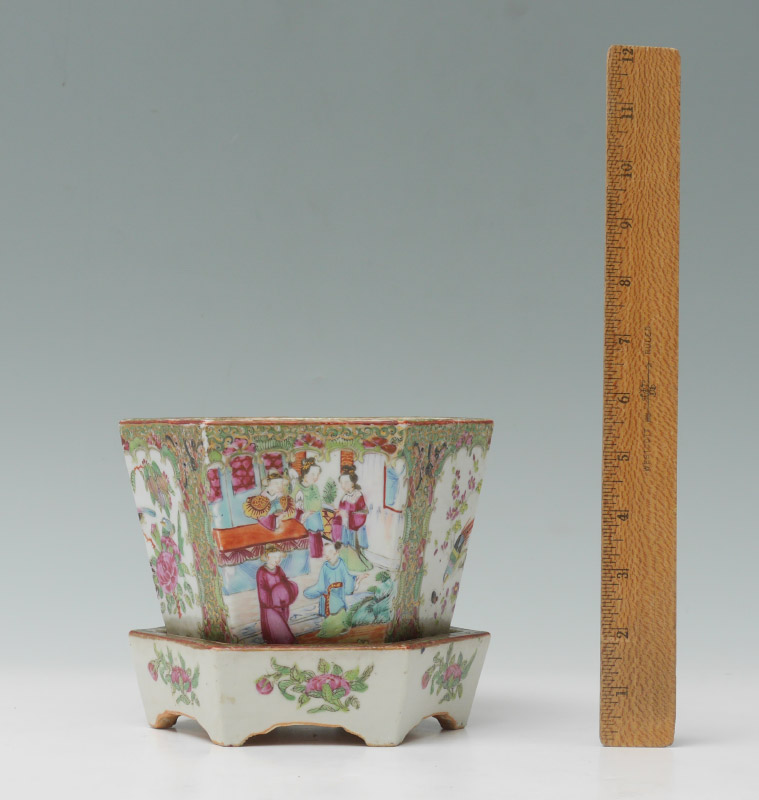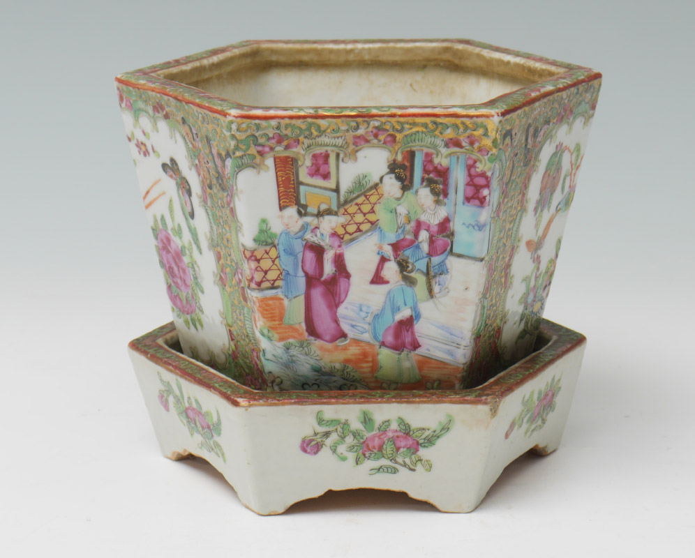 CHINESE ROSE MEDALLION FLOWER POT AND UNDERPLATE: 2 pieces total to include 1) Rose medallion 6 sided flower pot, typical genre scenes and floral motifs in reserves, 5'' h. x 6''. 2) Famille rose underplate, 1 3/4'' h. x 5 3/4''.