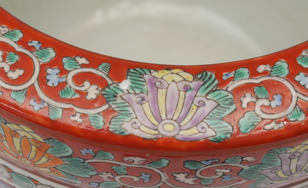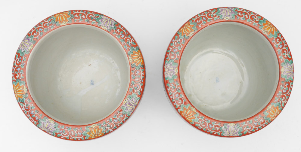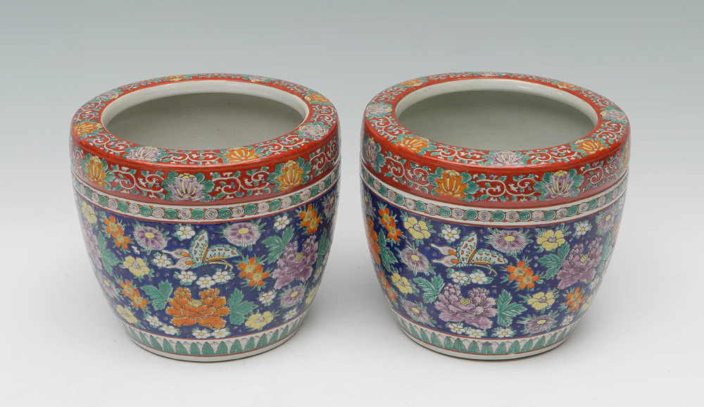 PAIR OF JAPANESE CERAMIC HIBACHI HAND WARMERS: Matched pair, incised polychrome decorated with bands of floral and insect decoration. Unknown blue mark inside bowl, overall measures 8 1/2'' h. x 9 3/4''.