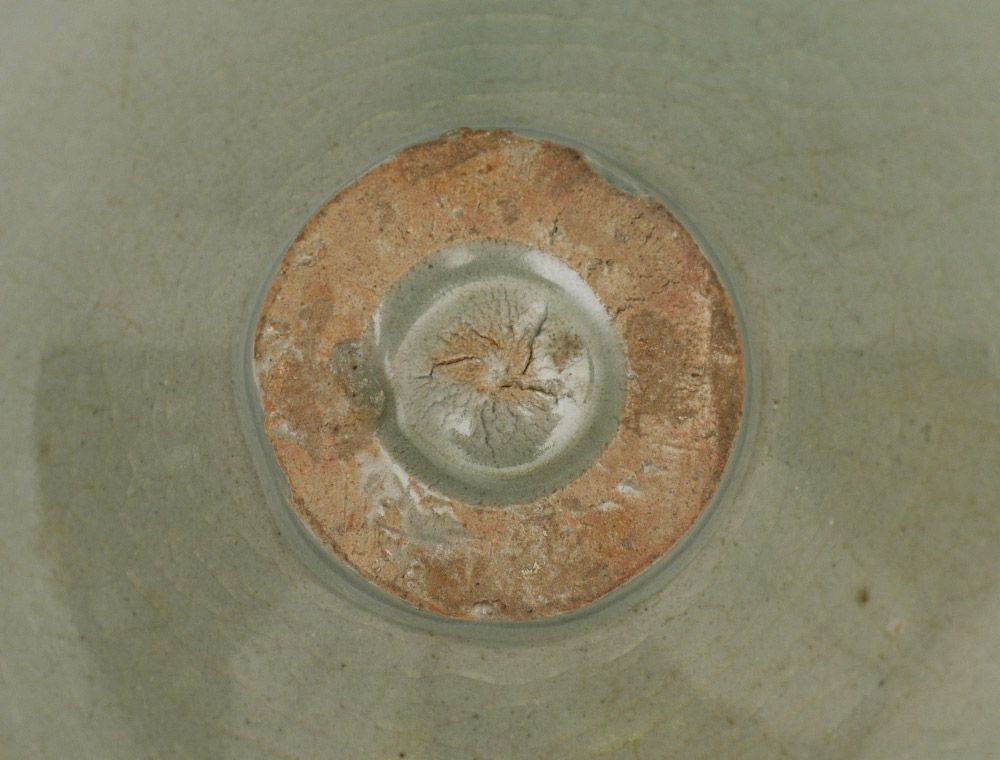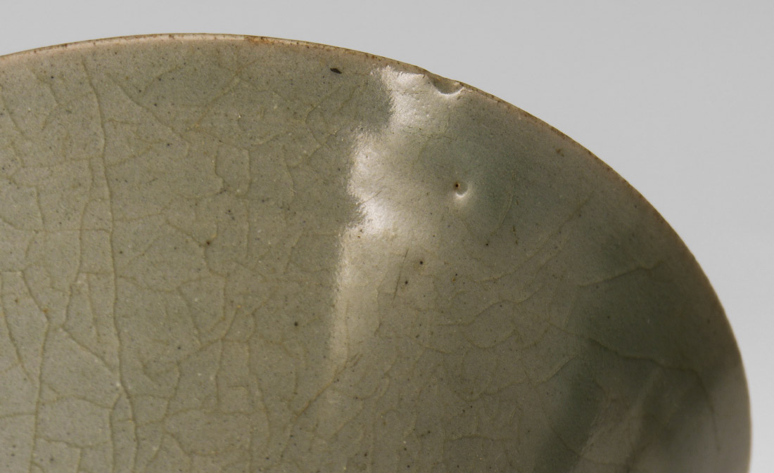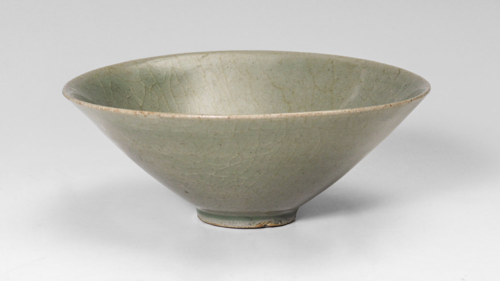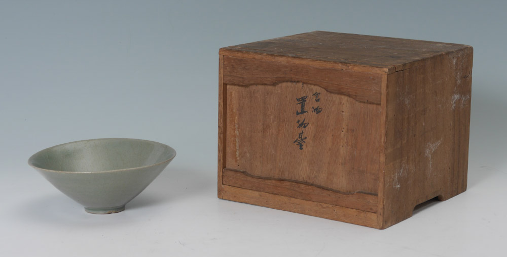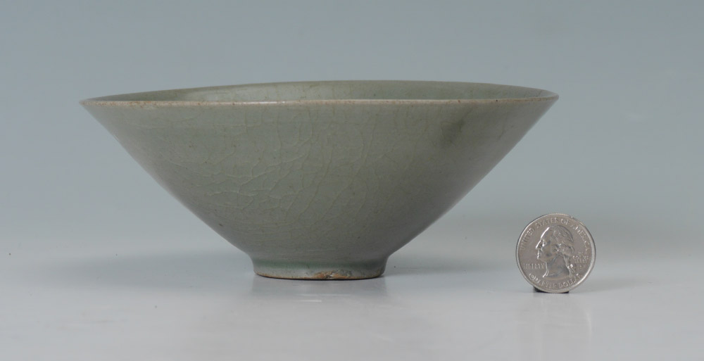 CHINESE CELADON FOOTED LOW BOWL: Conical form flaring from foot, crackle celadon glaze. 2 1/2'' h. x 6'' dia. Sold with a wood box, 6 3/8'' h. x 8'' x 7 3/4''.