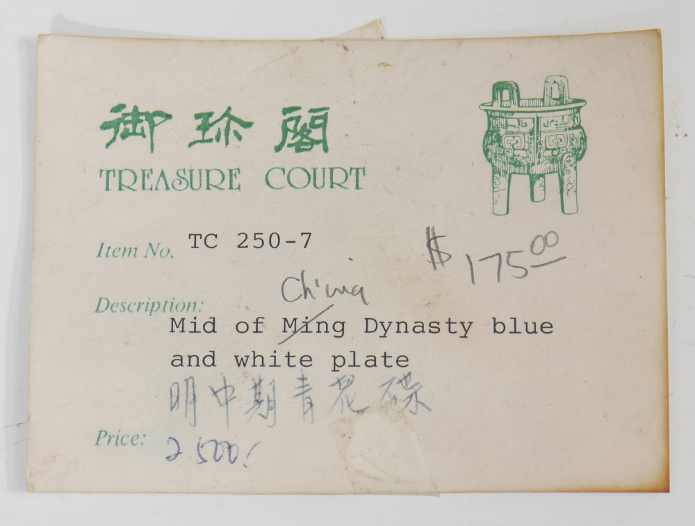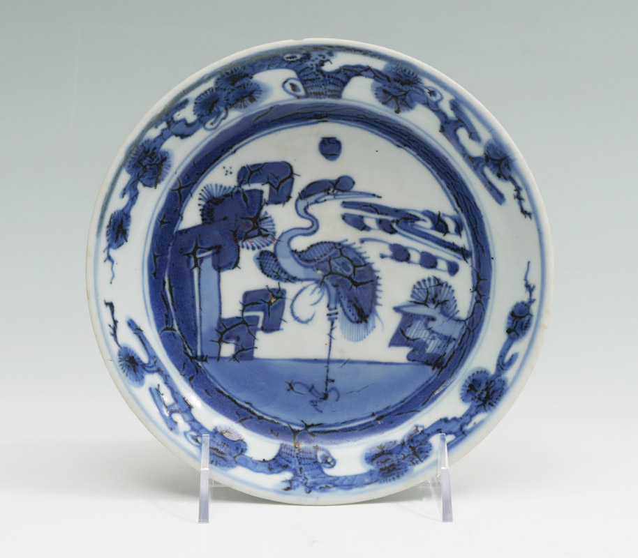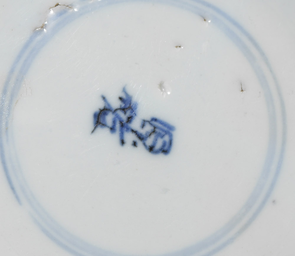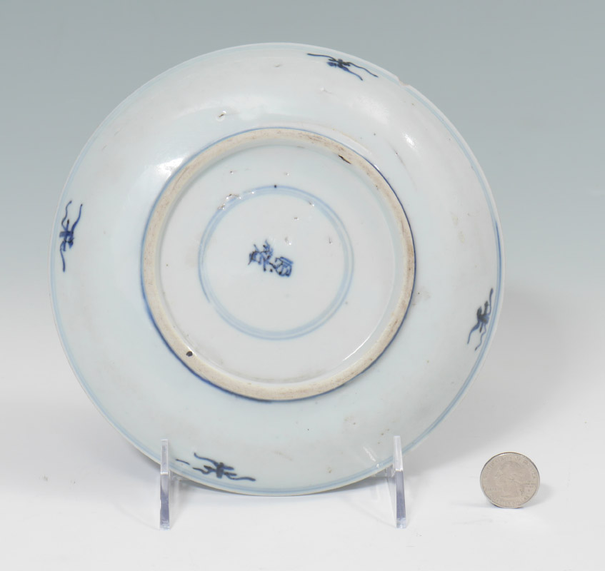CHINESE QING DYNASTY BLUE & WHITE BOWL: Shallow bowl, center with crane and foliate motif, rime with foliate motif, signed on base with unknown symbol mark in double circle. 1 1/2'' h. x 7 1/2'' dia.