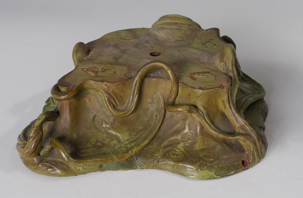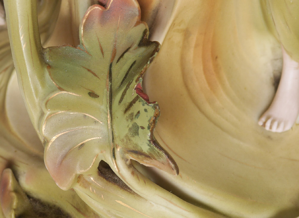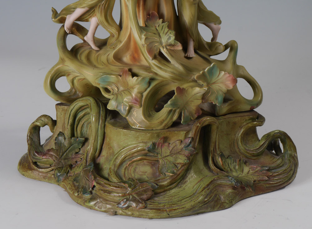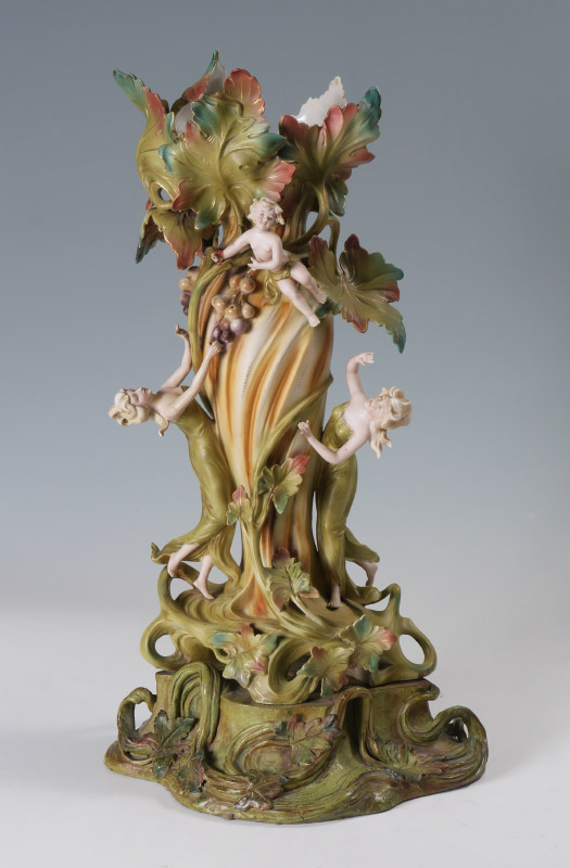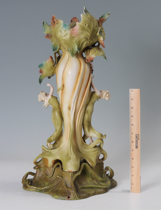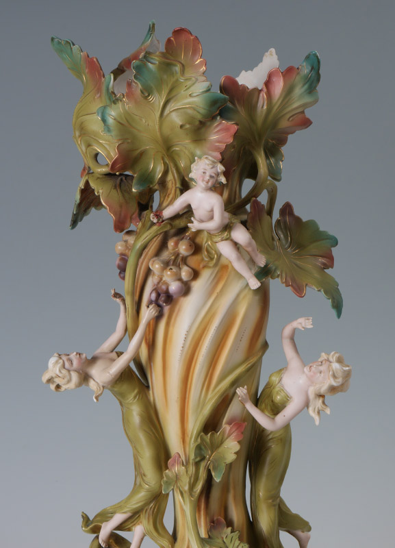 ART NOUVEAU PORCELAIN FIGURAL VASE: Figural group with 2 maidens and putti with leaves, branches and berries. 18 1/0'' h. x 9'' x 6 1/2'' Sold with a matching carved wood 3 3/4'' h. x 11 1/2'' x 9 3/4''.
