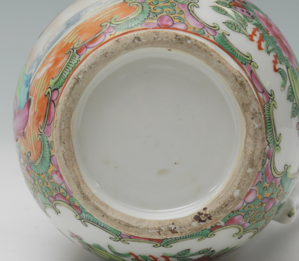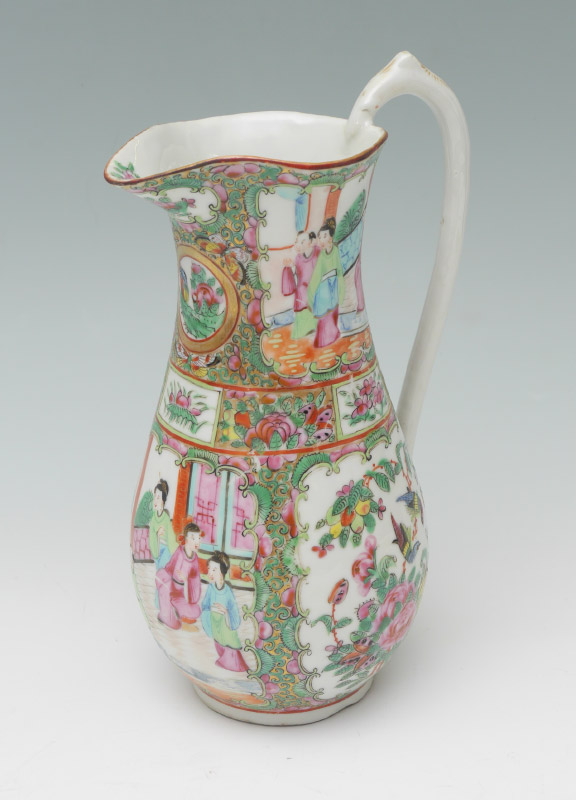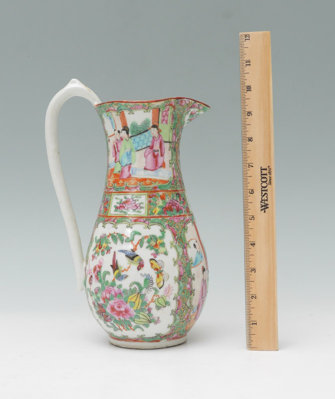 CHINESE ROSE MEDALLION WATER PITCHER: Floral decoration inside spout, exterior with genre scenes and floral motifs in reserves. Unmarked, 10 3/4'' h. x 6 3/4''.