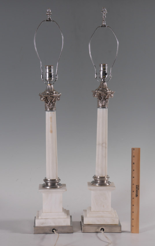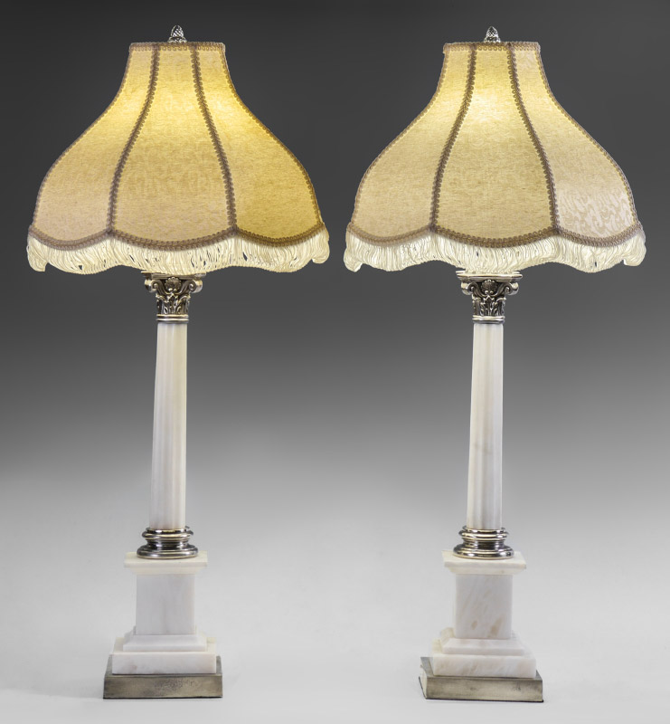 STIFFEL ALABASTER LAMPS: Silverplated mounts on alabaster Greek columns, approx. 32'' tall.