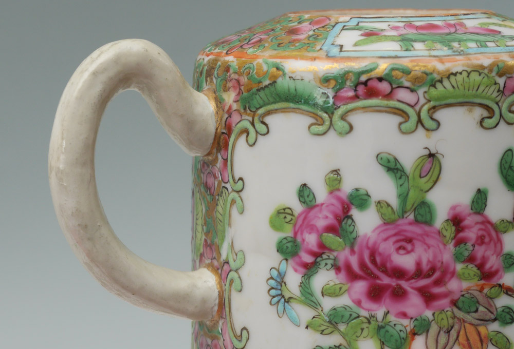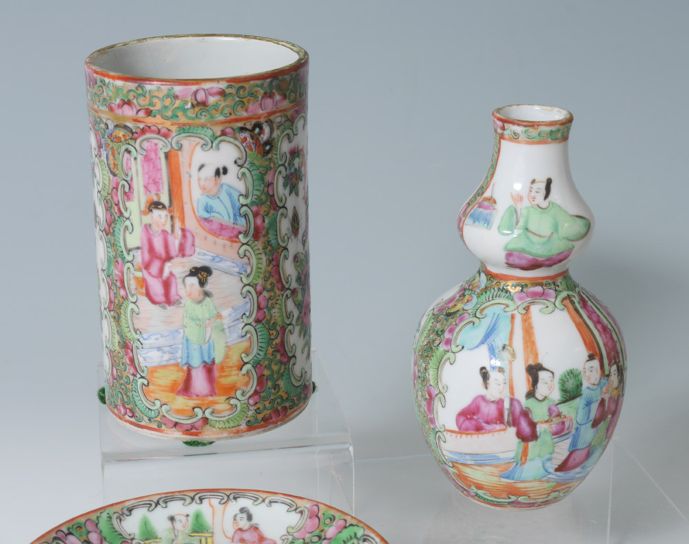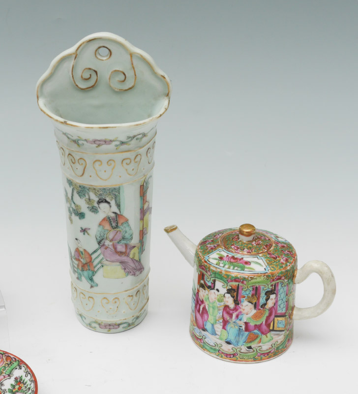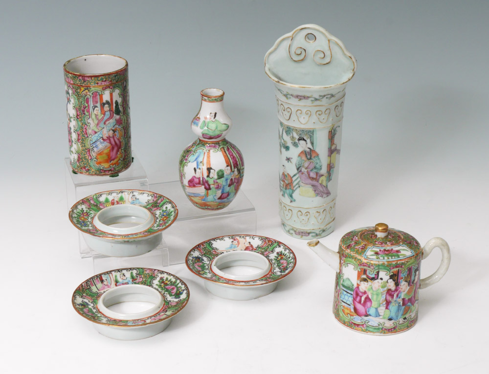 7 PIECE CHINESE ROSE MEDALLION: 7 pieces total to include 1) Diminutive double gourd vase, 5'' h. x 2 1/2''. 2) Cylinder vase or brush pot, 4 1/2'' h. 3) Diminutive teapot, 4'' h. x 5''. 4-6) Ring inserts or bobeche, 4 1/4'' dia. 7) Famille rose wall pocket 9 1/2'' h. x 3 3/4'' x 2 1/4''.