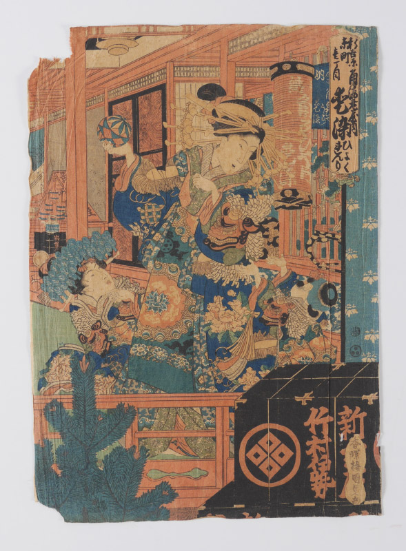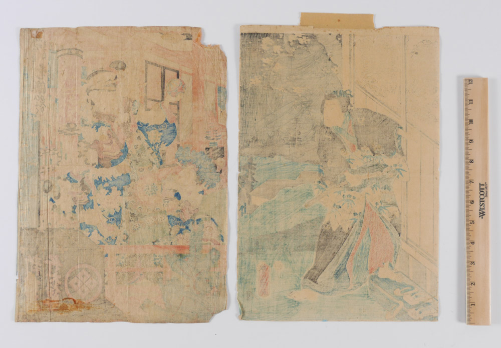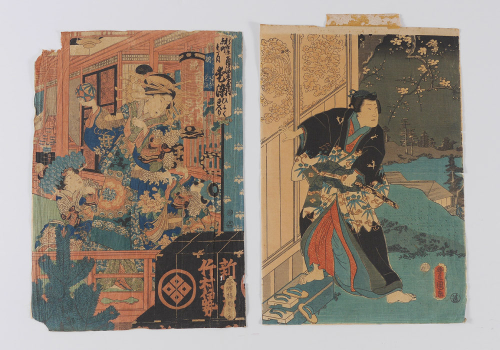 CONDITION: Both pieces have condition issues, Samurai has partial loss in the lower right corner, several spots of foxing, visible creasing, Geisha has loss in upper and lower left corners, with some insect damage, both pieces have overall browning, sold as is.