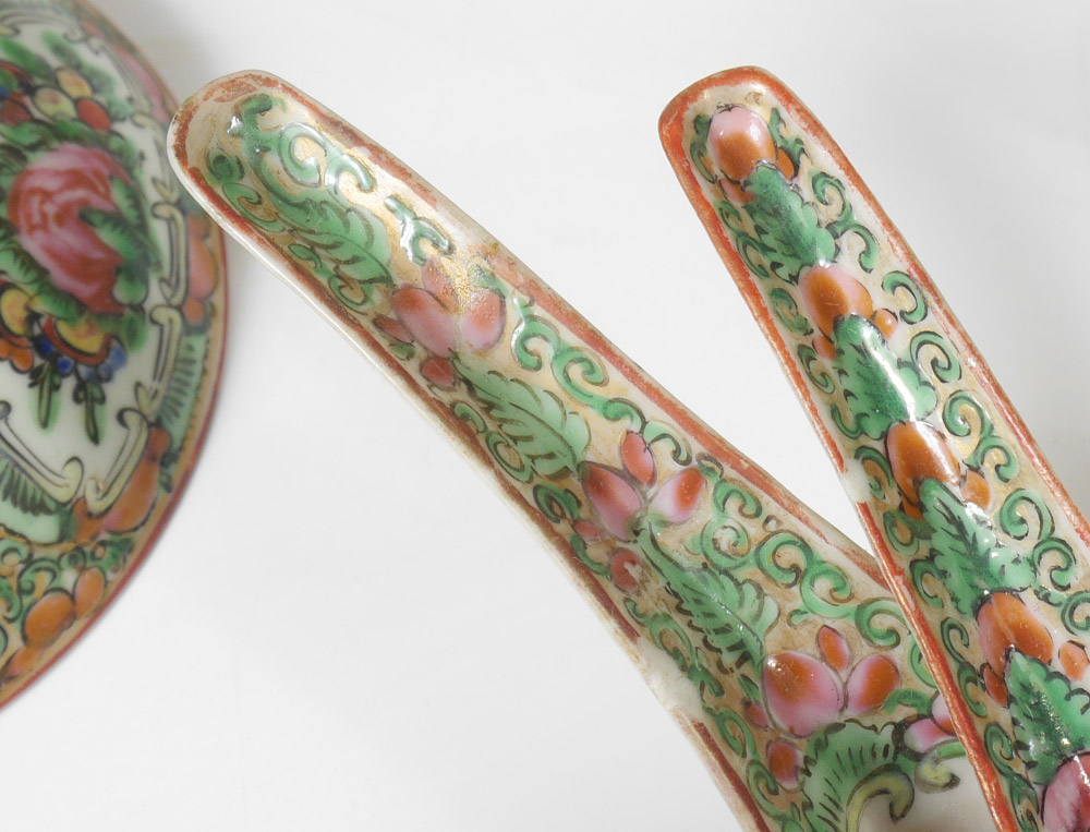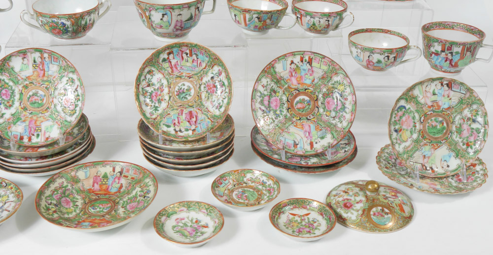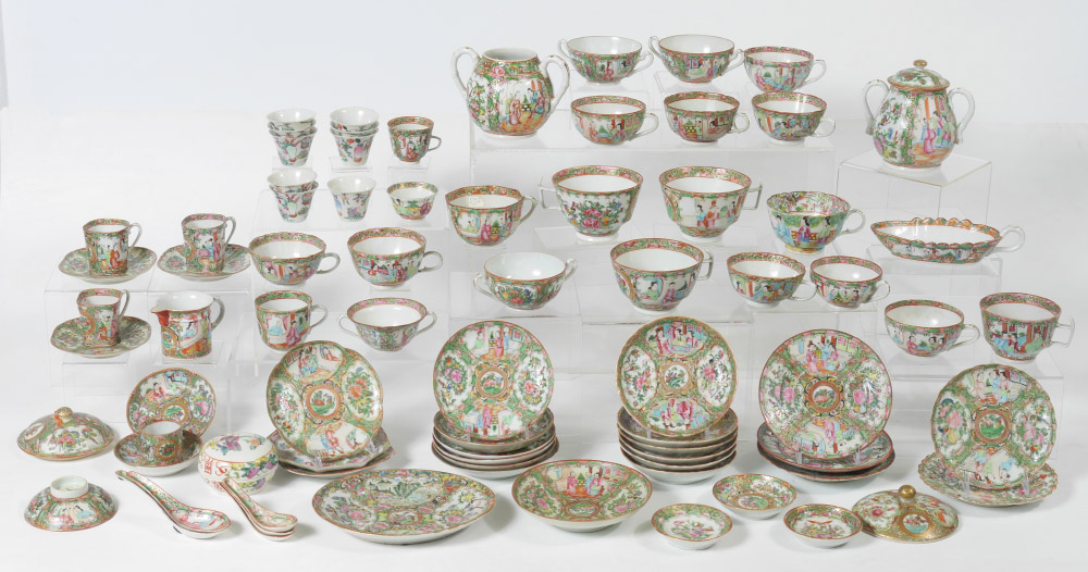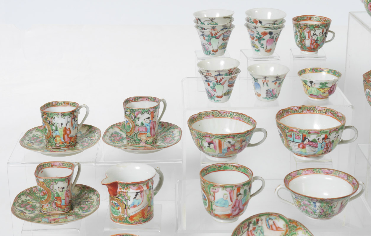77 PIECES CHINESE ROSE MEDALLION ESTATE COLLECTION: Approx. 77 pieces of assorted tea cups, demitasse cups, saki cups, saucers, covered and open sugar, spoons and more.