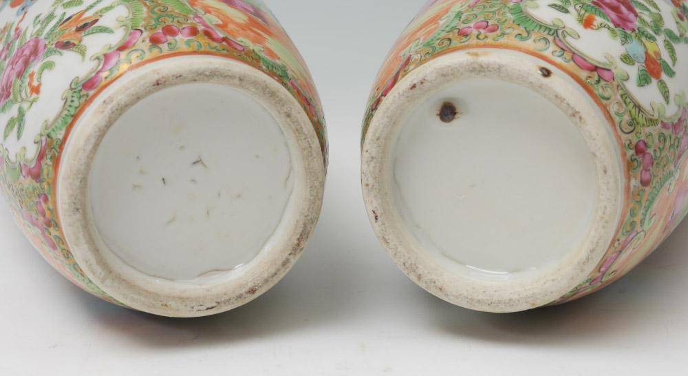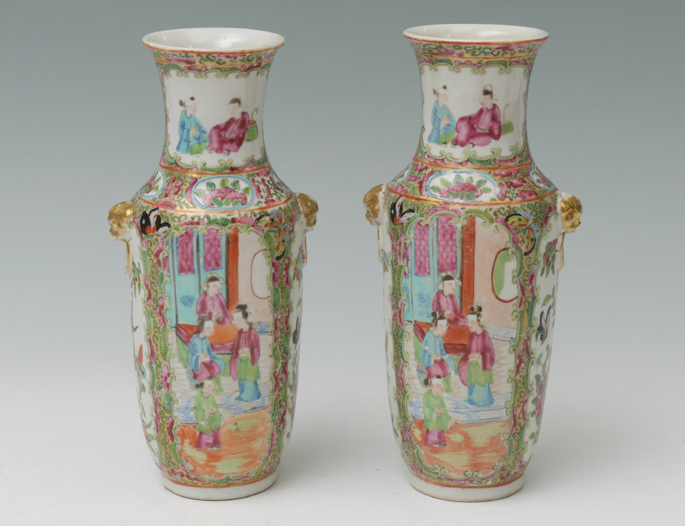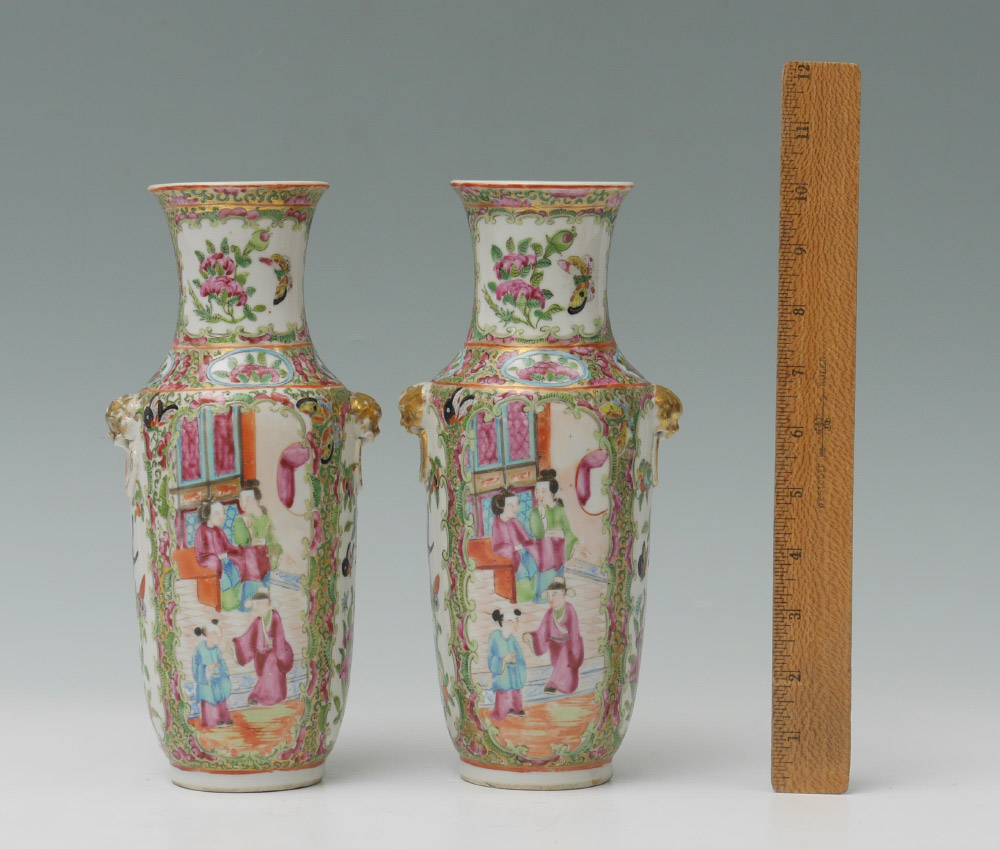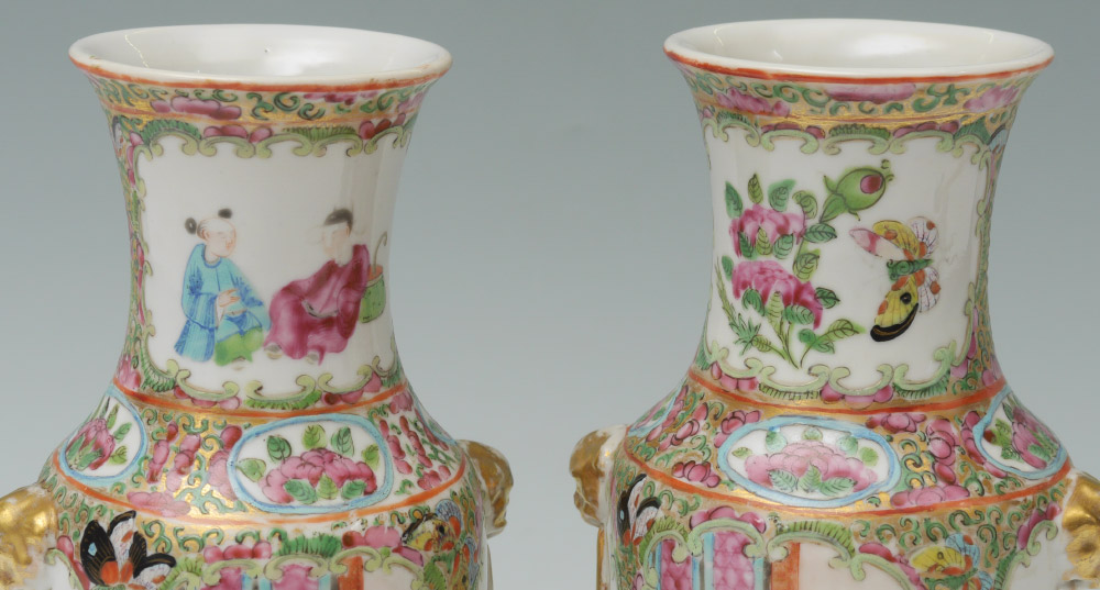PAIR CHINESE ROSE MEDALLION VASES: Baluster form vases, genre scenes and floral decoration in reserves, applied lion head gilt handles. Unmarked, 9 7/8'' h. x 4 1/2''