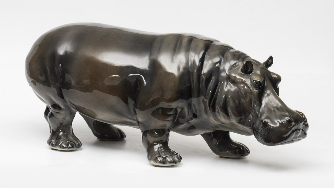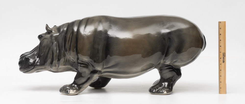 ITALIAN CERAMIC HIPPOPOTAMUS: Signed on back foot Mourau?, Made in Italy, 1282. Measures approx. 13 1/2'' h. x 32'' x 11 1/2''.