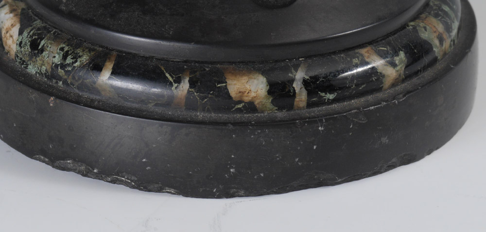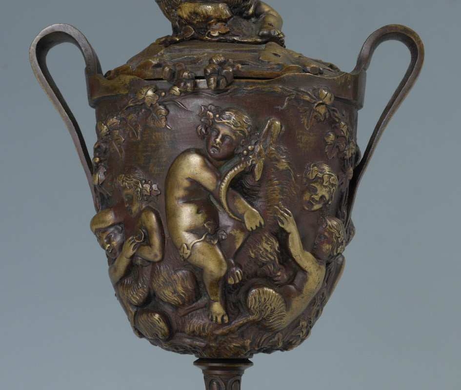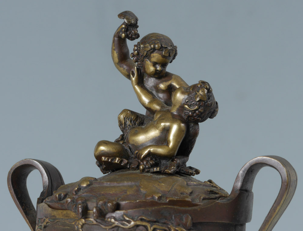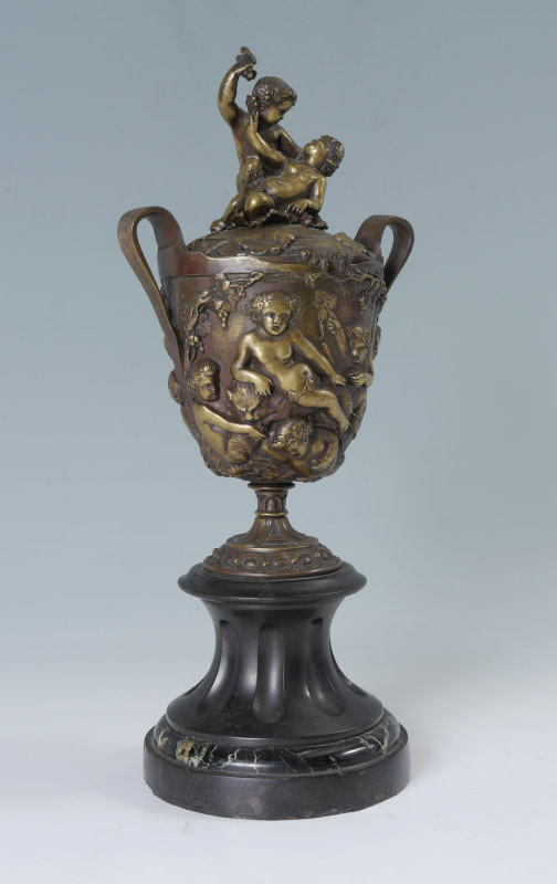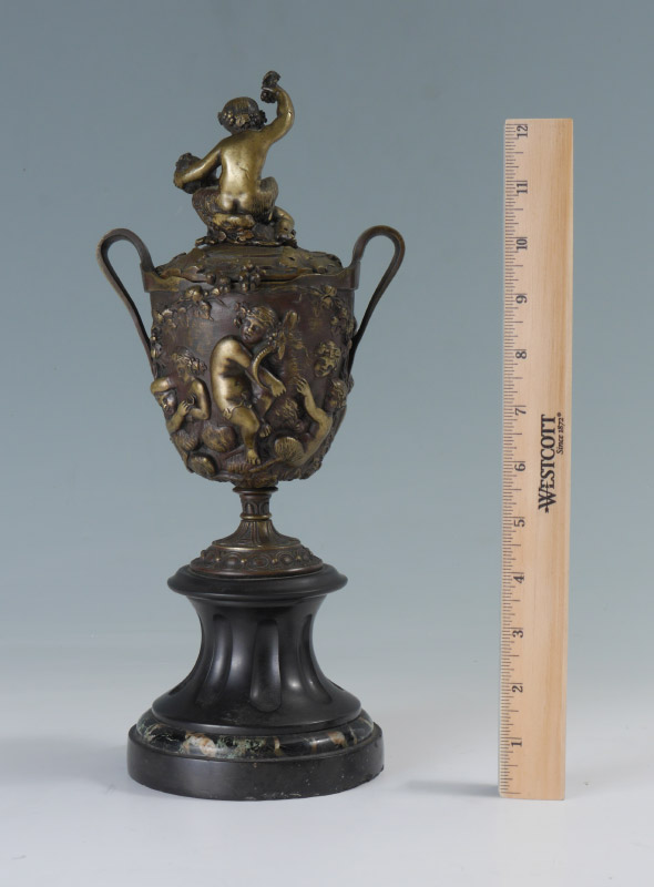 BRONZE FIGURAL COVERED CHALICE ON MARBLE BASE: Removable lid with figural putti final, double handled figures of Bacchus and putti with grave vines. Mounted to metal column on marble base. Overall measures 13 1/4'' h. x 5 3/4''.