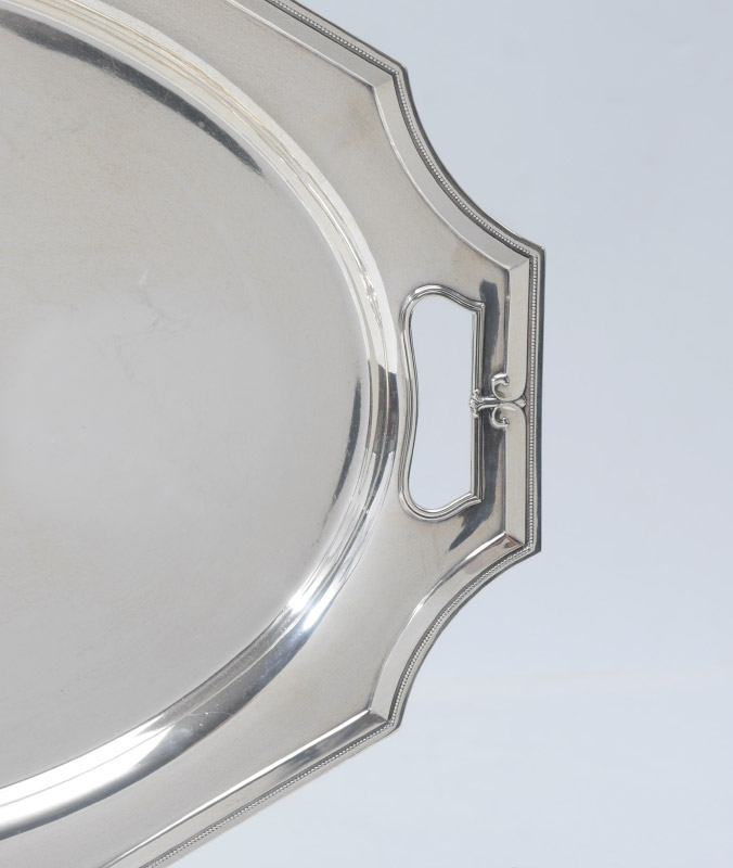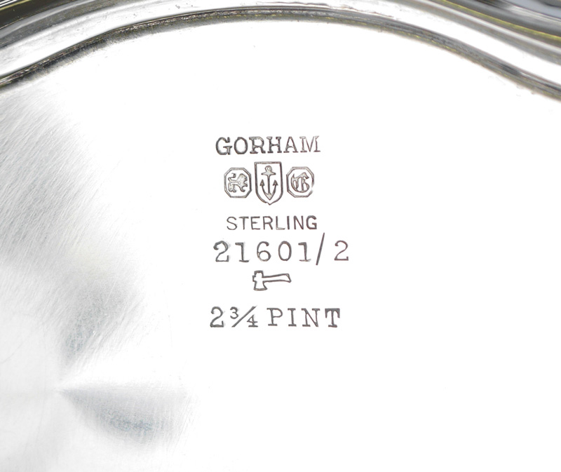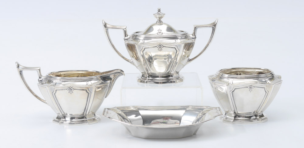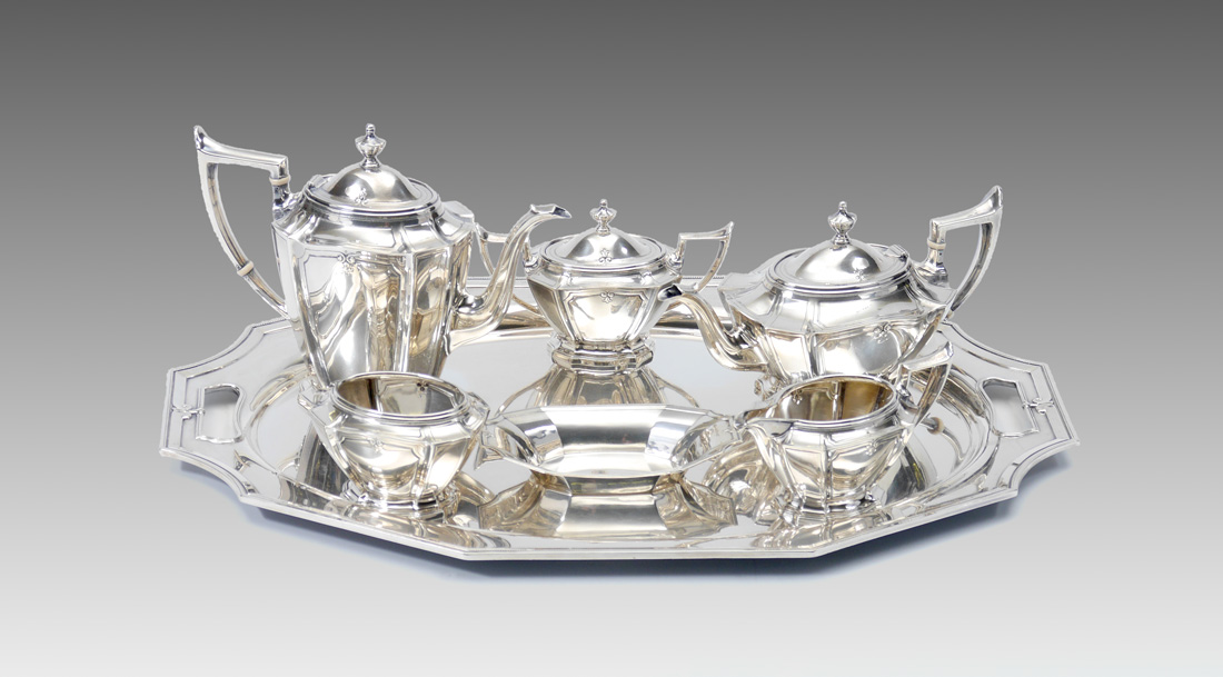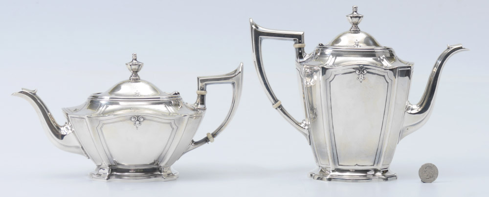 GORHAM KING ALBERT STERLING SILVER TEA SERVICE: 7 piece 1930's service set in the King Albert pattern by Gorham to include 1) Coffee pot, 21601/2, 2 3/4 pint, 7 3/4'' h. x 11''. 2) Teapot, 21602-2, 2 pts, 5 3/4'' h. x 11''. 3) Open creamer, 21604/2, 3/4 pint, 3 3/4'' h. x 7 1/8''. 4) Covered sugar, 21603/2, 5'' h. x 7 1/2''. 5) Waste bowl, 21605-2, 3 1/4'' h. x 4 3/4''. 6) Small bon bon tray, 4051, 1'' h. x 7 1/8'' x 4 1/4''. 7) Handled Tray, A1612, 25in, 25'' x 17''. Approx. 173 troy oz. total.