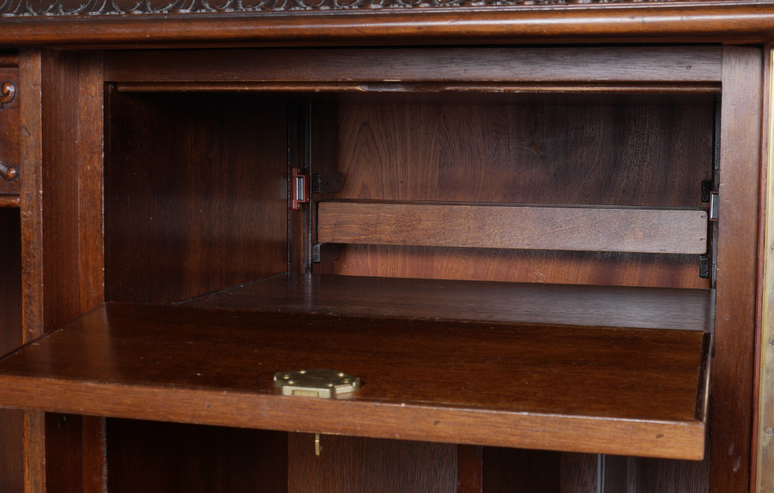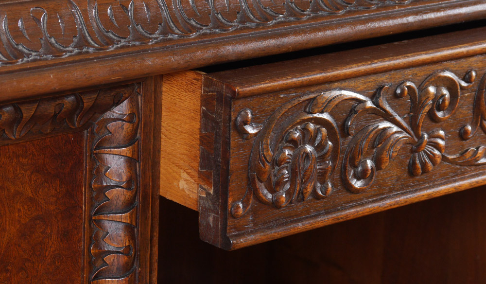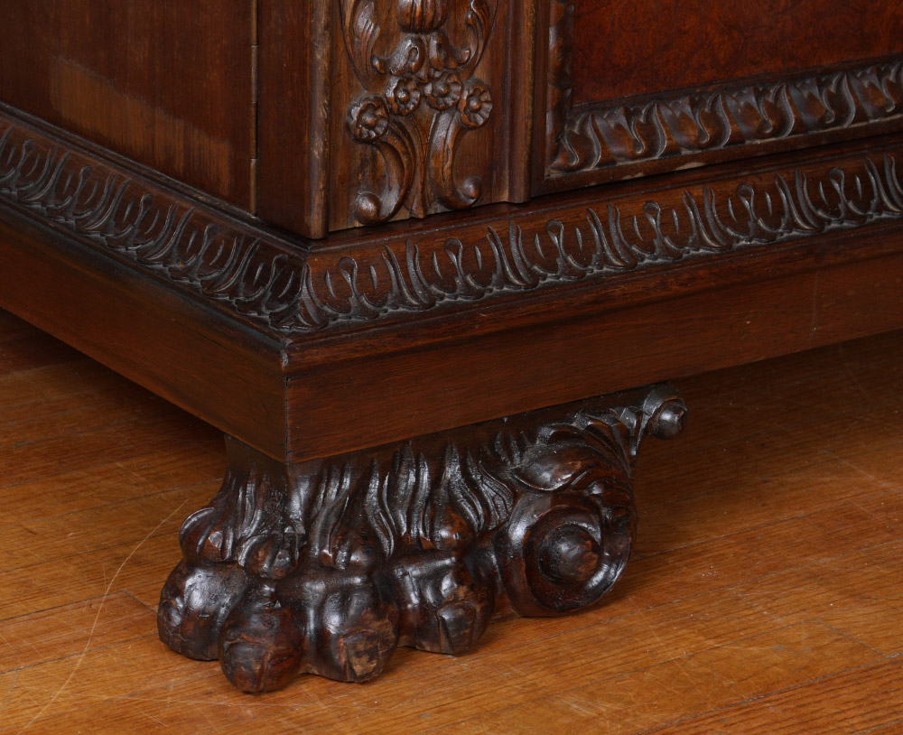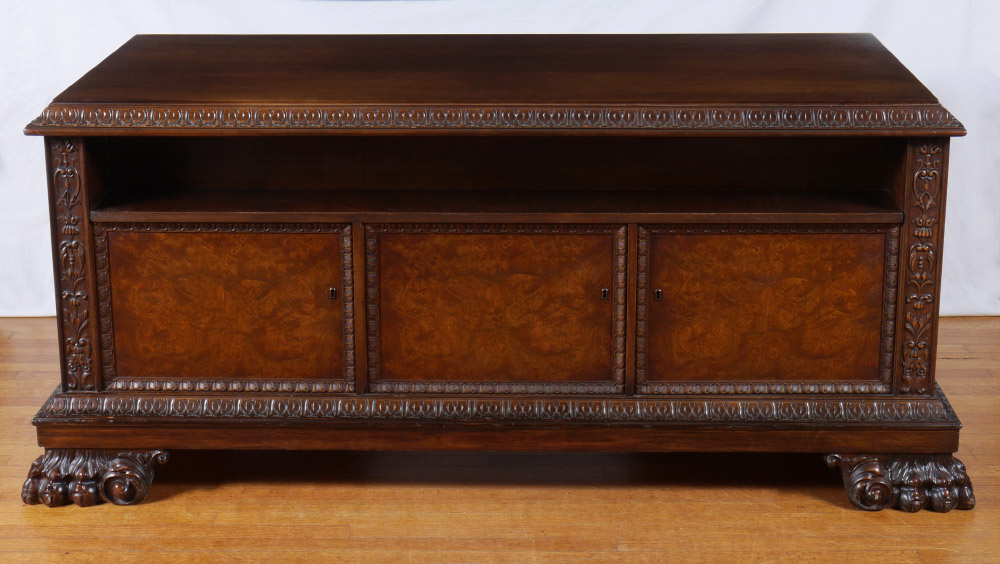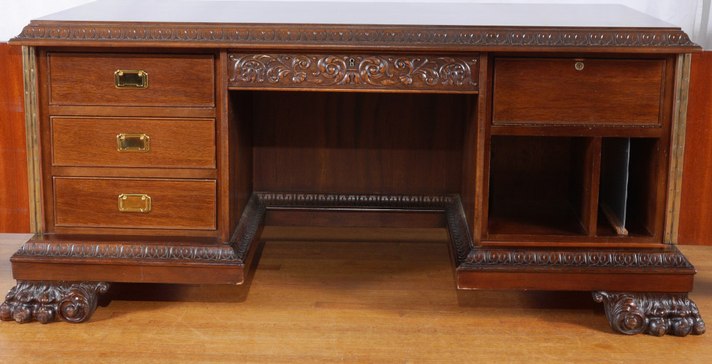 LARGE BURLWOOD PAW FOOT EXECUTIVE DESK: Top with carved shaped border, single central drawer with carved foliate scroll front, single door either side with burl veneer, carved trim. Right side with locking drawer over open compartment, file storage; left side with 3 drawers. Front of desk with open shelf over 3 doors with burl veneer and shallow storage. Foliate carved stiles on both sides, all on large paw feet. Overall measures 31'' h. x 74 1/2'' x 38''.