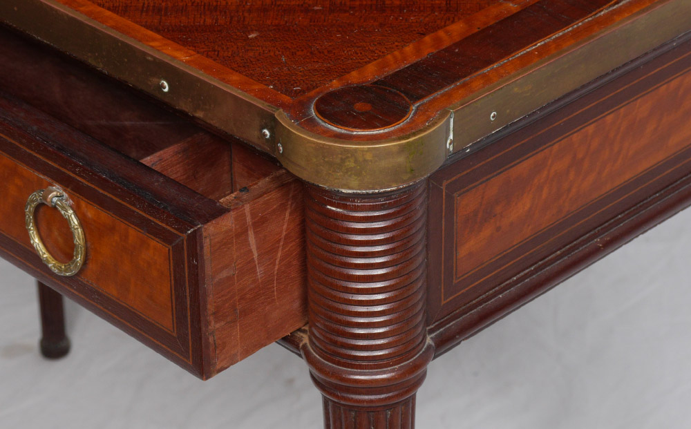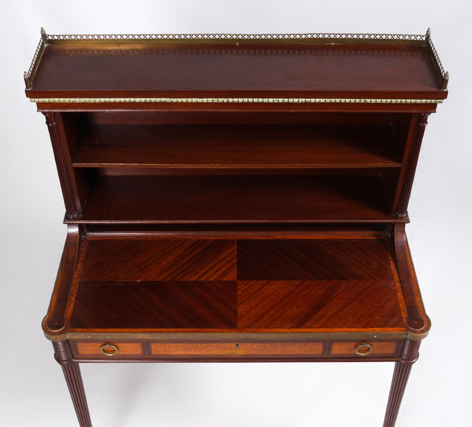 SHERATON STYLE LADIES DESK AND CHAIR: Late 19th century Sheraton style desk, pierced brass gallery over open shelves, banded mahogany inlay writing surface with cookie corners and brass trim. Single full length drawer, reeded legs, 48'' h. x 34 1/4'' x 19''. Diminutive upholstered chair with carved skirt, reeded legs, 27'' h. x 19'' x 19''.