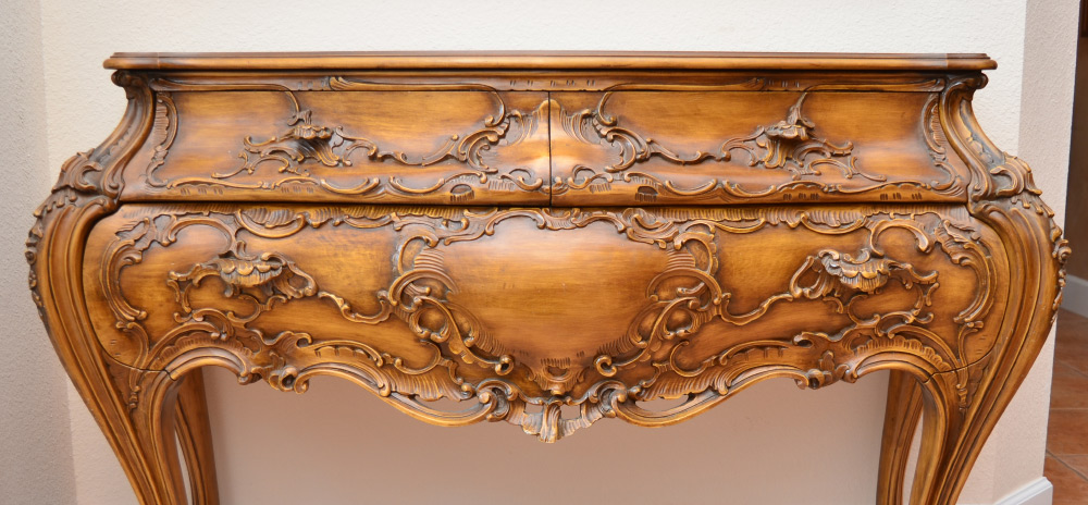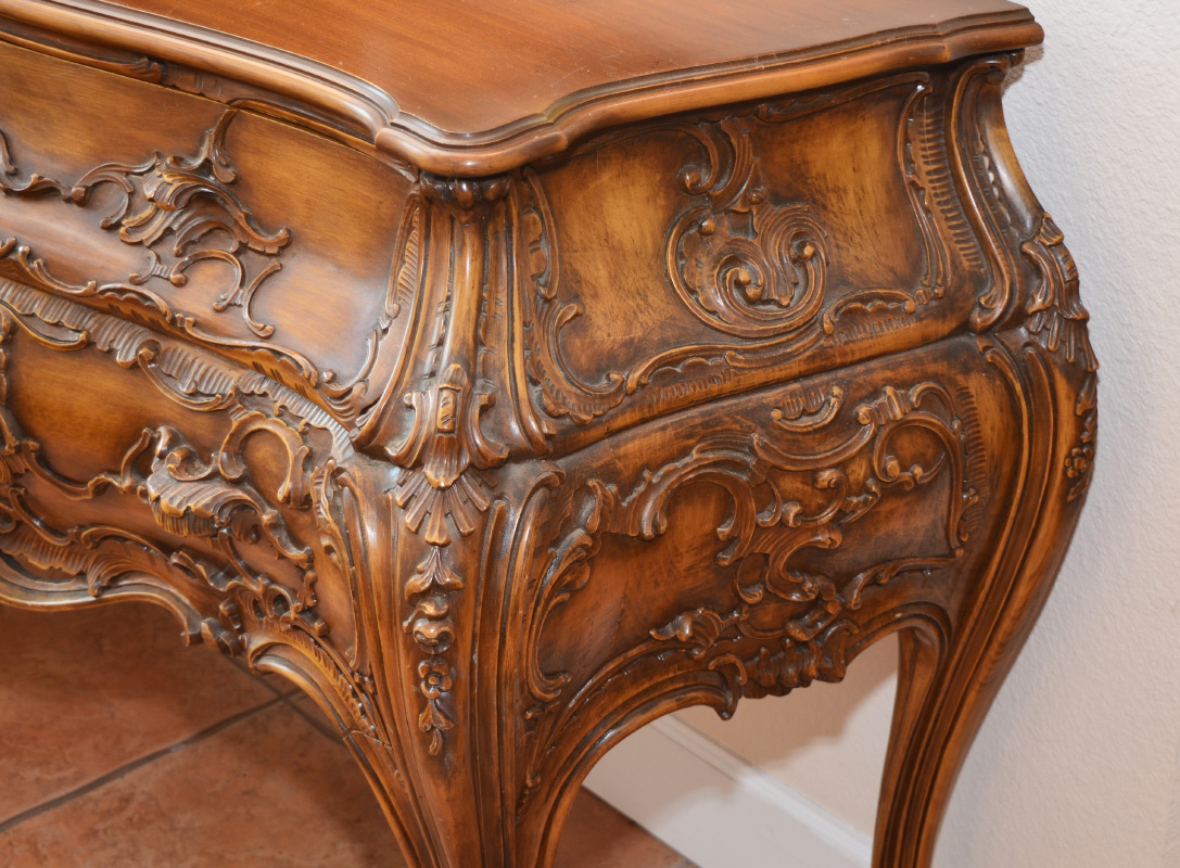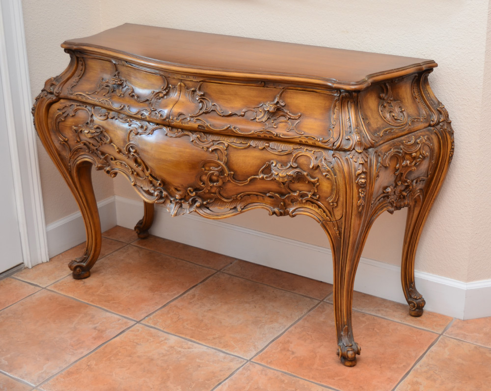 ITALIAN STYLE CARVED BOMBE COMMODE: Serpentine top chest with bombe swell front and sides with carved foliate scroll motifs. 2 half drawers over full length drawer, carved and shaped legs. 35'' h. x 56'' x 21 3/4''.