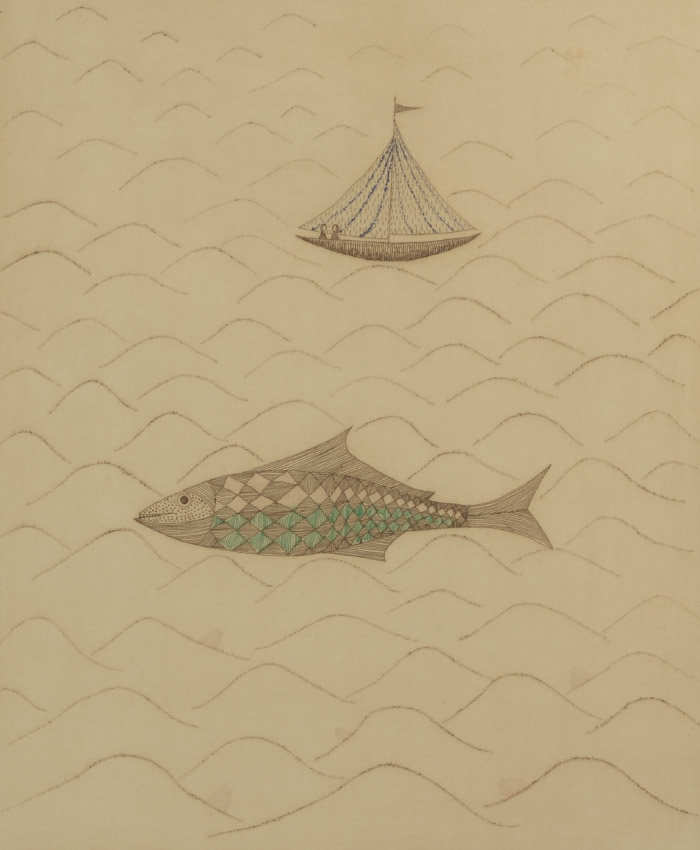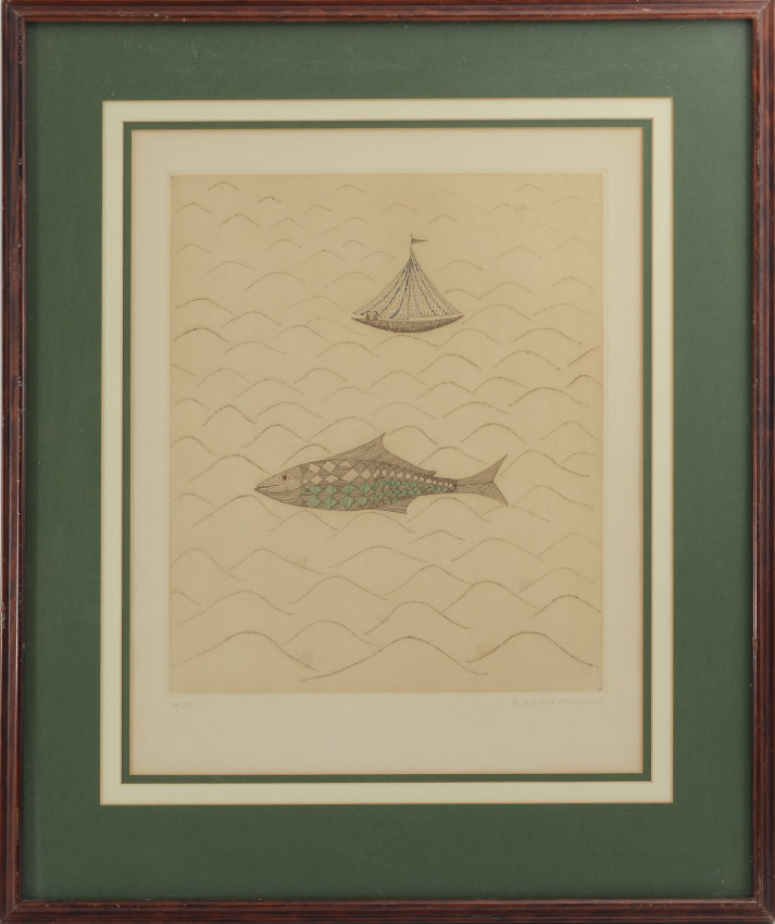 MINAMI, Keiko, (Japanese, 1911- 2004): Large Fish and Sailboat, Etching, sight size 16 1/2'' x 13'', pencil signed lower right, numbered 14 of 50 lower left, framed, 24'' x 20 1/4''.