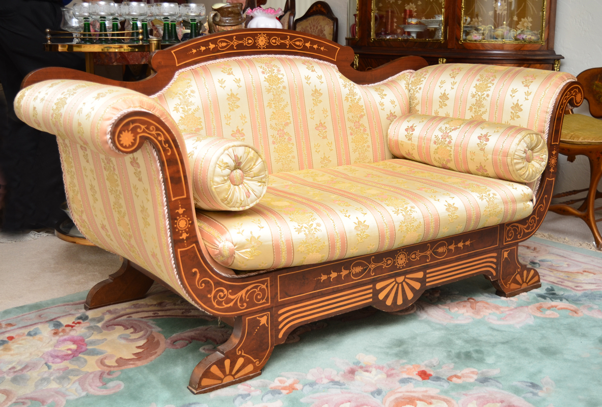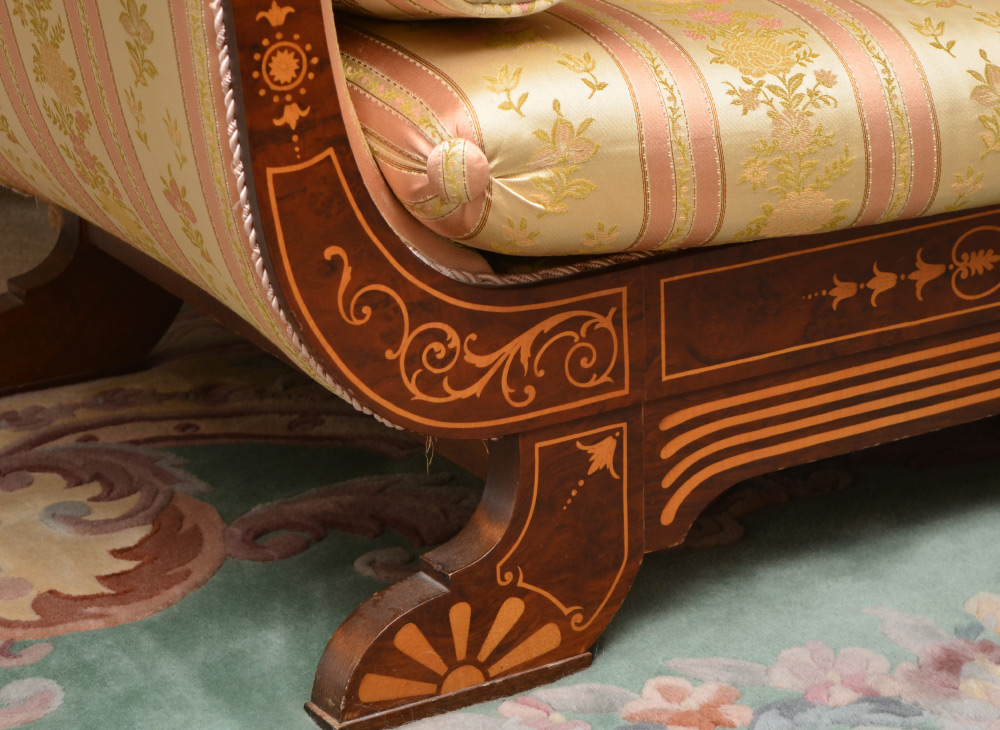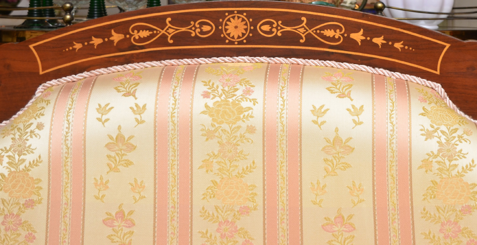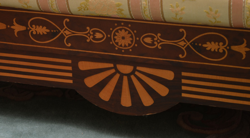 REGENCY STYLE INLAID SETTEE: Dutch style marquetry on shaped back rail continuing on front of scroll arms, skirt and front legs. Floral striped patterned upholstery, 33 1/4'' h. x 65'' x 30''.