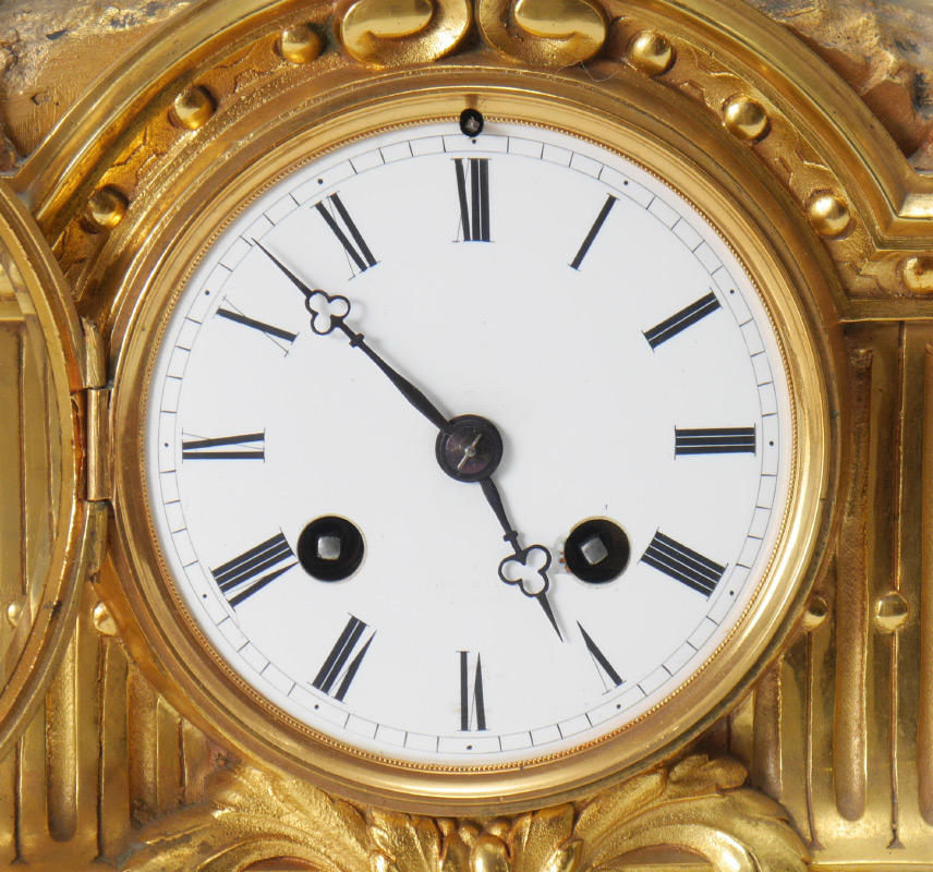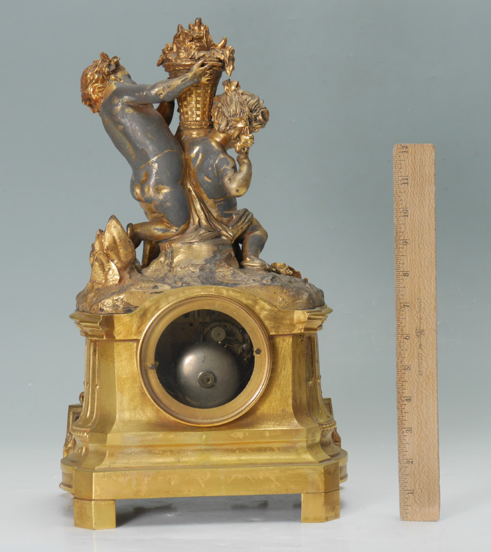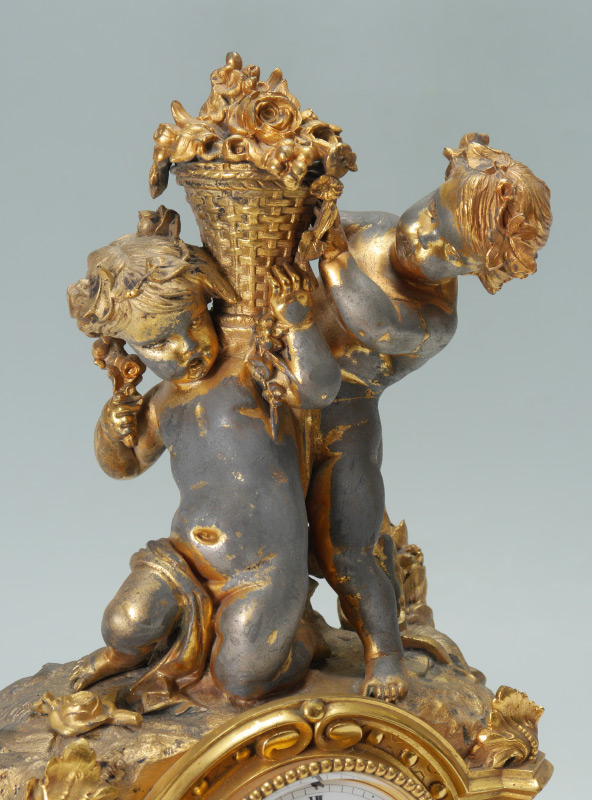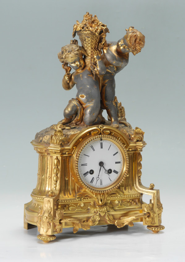 HENRI MARC FRENCH GILT METAL FIGURAL MANTLE CLOCK: Gilt metal finial with 2 figural putti holding a basket of flowers. Architectural case with applied and cast decoration, all on 4 feet. Porcelain dial with Roman numerals, time and strike movement marked H. Marc Paris in circle. Overall measures 16 1/4'' h. x 10'' x 6 1/2''.