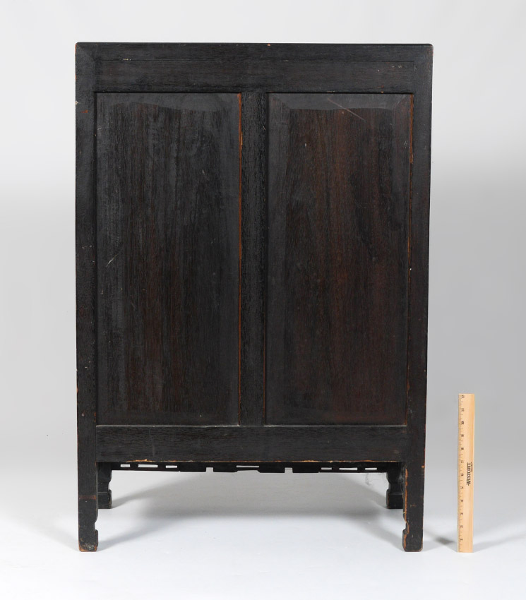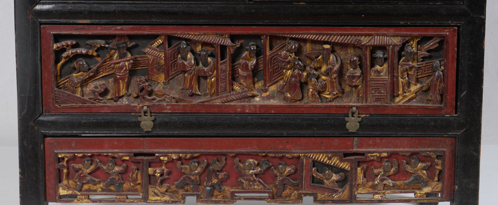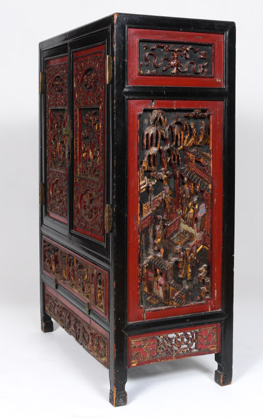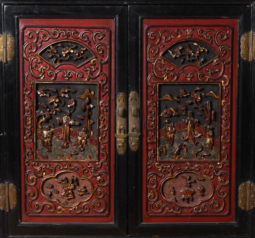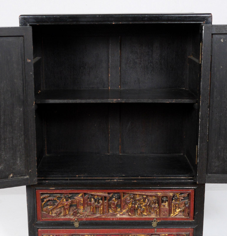 CHINESE RED LACQUERED AND GILT CUPBOARD: 2 doors over single full length drawer with carved red lacquer & gilt wood outdoor genre scenes. Additional carved panels on sides and skirts, overall measures 38'' h. x 28'' x 13 1/2''. Former property of a US Foreign Service Officer living in Post-War China (1945-).