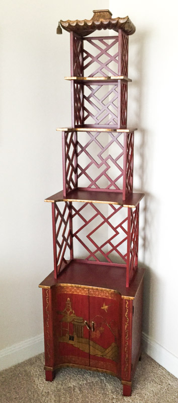 CHELSEA HOUSE JAPANESE STYLE STACKING CABINET: In 4 sections, red and gilt decoration, top with carved gilt wood valence, top 3 section with open sides and back. Curved front 2 door base with gilt chinoiserie decoration, overall assembled measures 84'' x 22'' x 15''