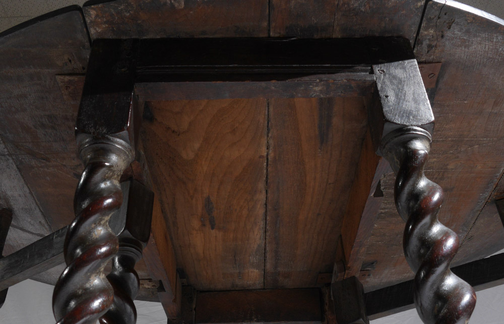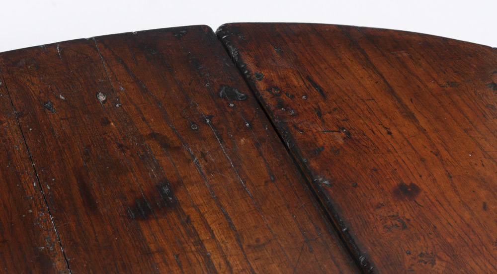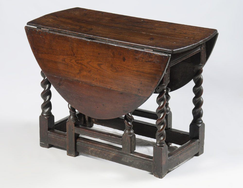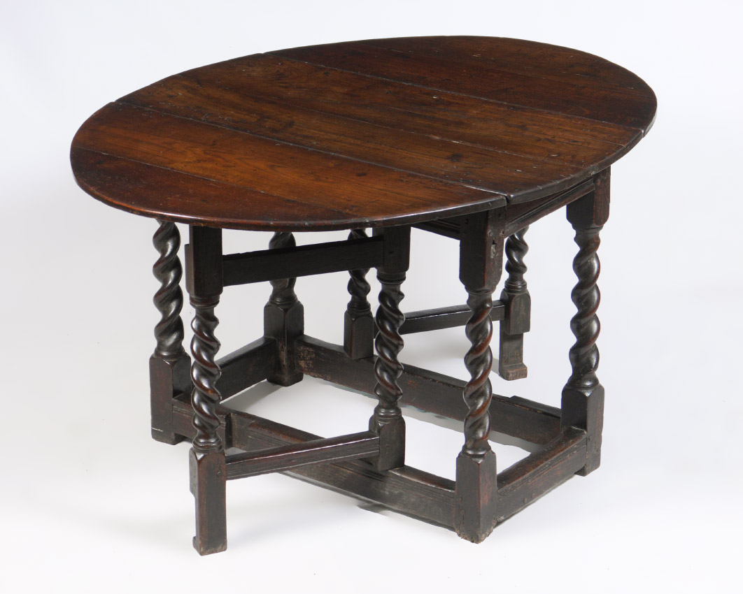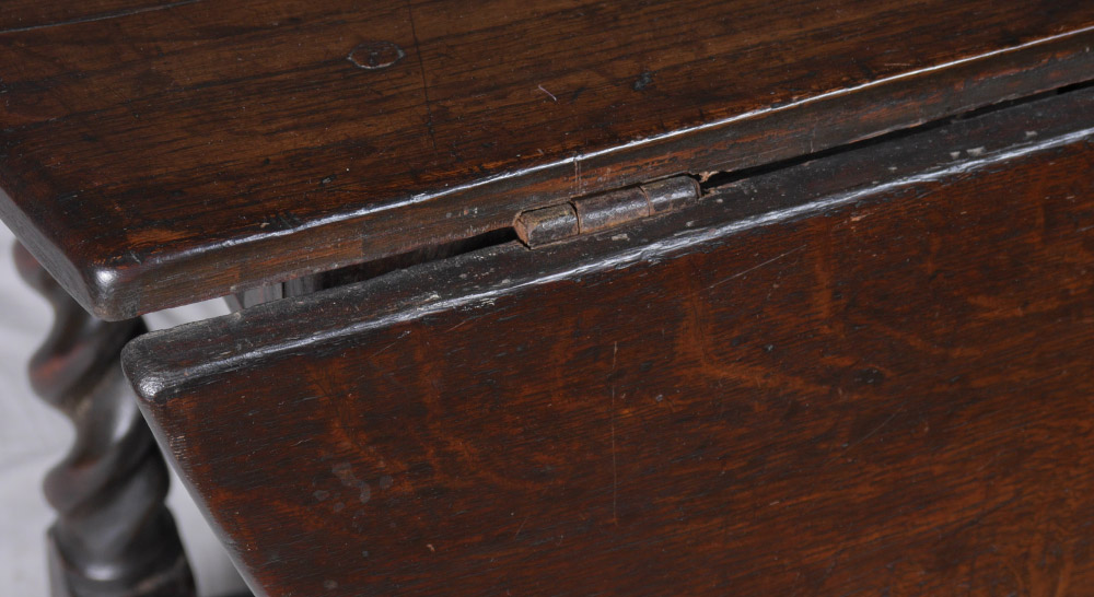 PERIOD WILLIAM & MARY GATELEG TABLE: Occasional drop leaf table with oval top, barley twist legs, hand forged nail and pegged construction. Overall measures 27 3/4'' h. x 38 1/22'' x 20'', each leaf 17'' long.