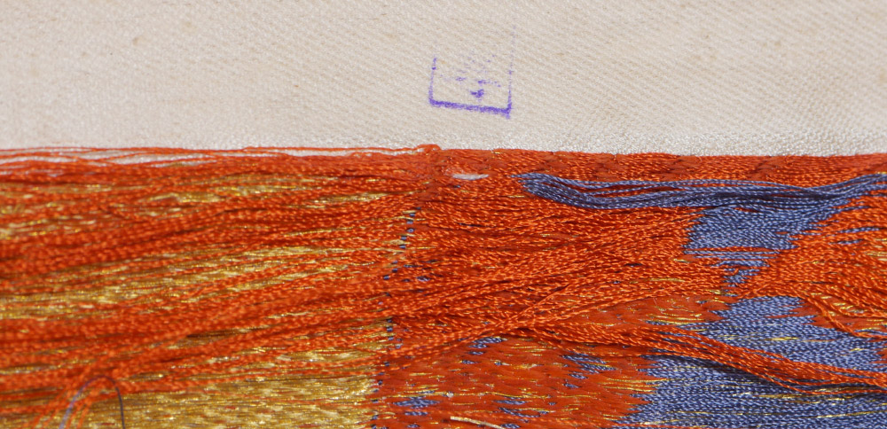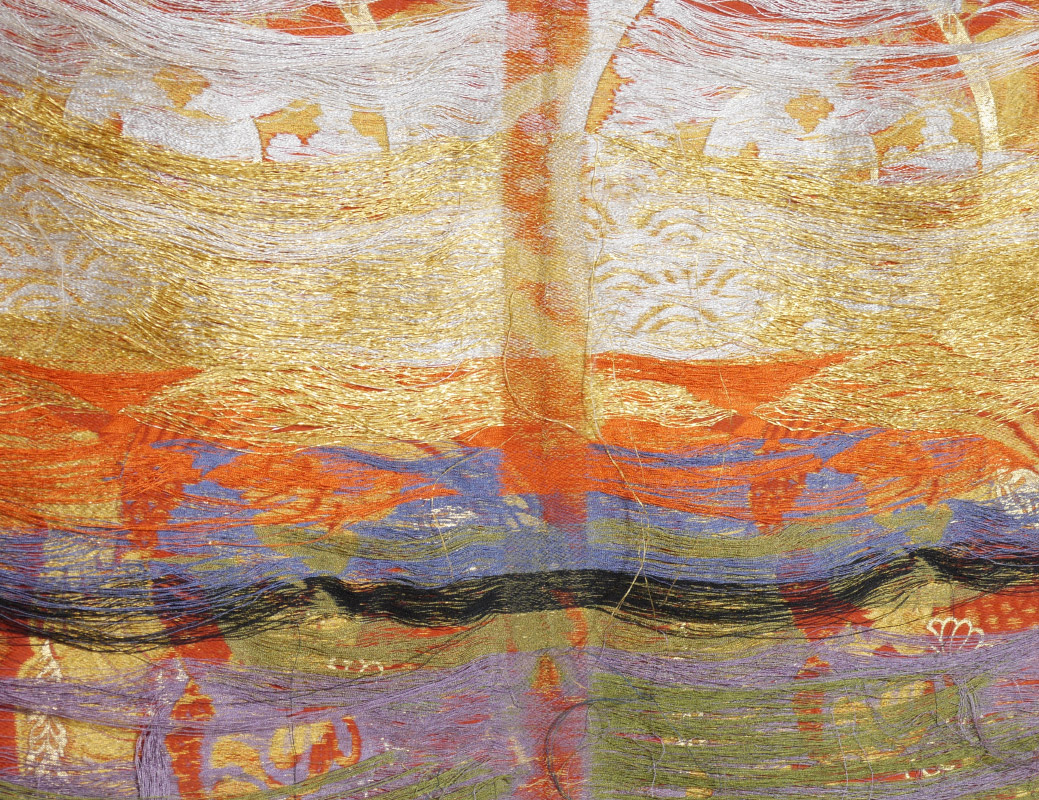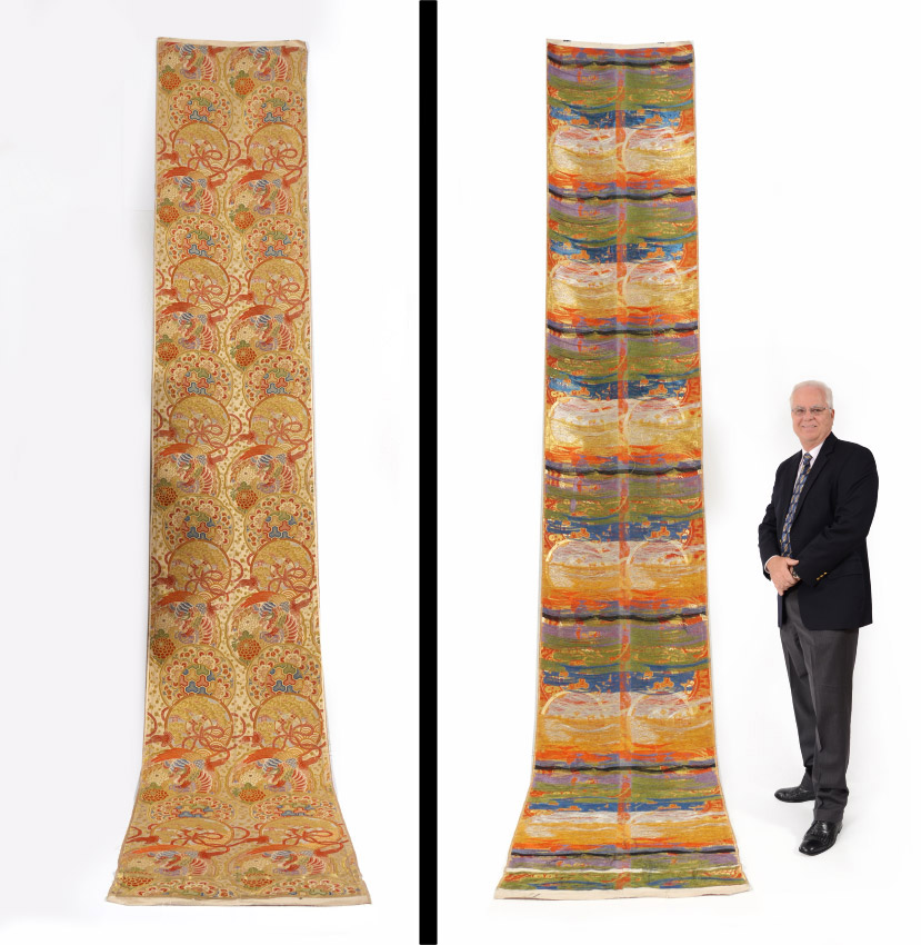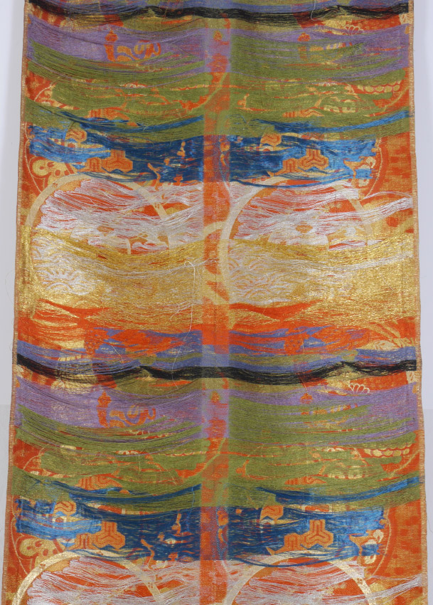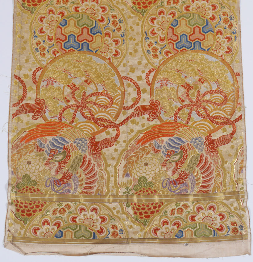 ORIENTAL SILK FABRIC WITH METALLIC THREADS: Deep color rich in gold metallic threads. The panel is not lined, ready for use as an obi, decorative ornament or garment. Measures approx. 27.25'' wide x 162'' length (4.5 yards). Former property of a US Foreign Service Officer living in Post-War China (1945-).