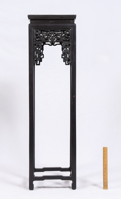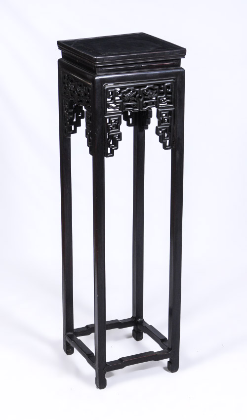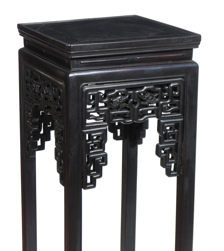CARVED ORIENTAL FERN STAND: Square top over openwork decoration featuring dragon heads, straight legs, shaped feet and stretchers. Overall measures 50'' h. x 13 3/4'' x 13 3/4''. Former property of a US Foreign Service Officer living in Post-War China (1945-).