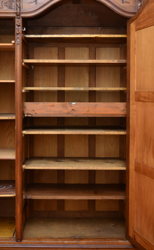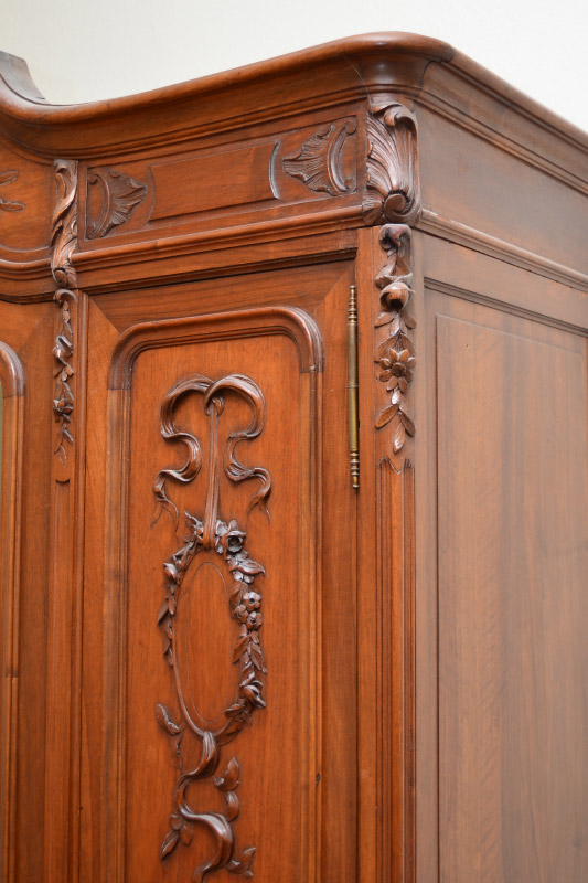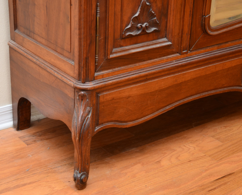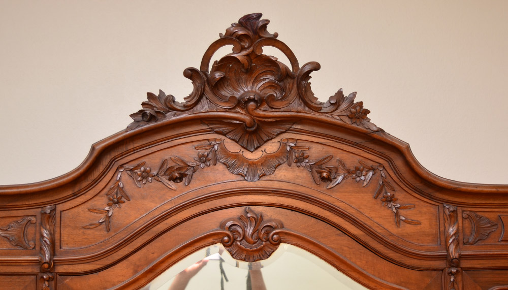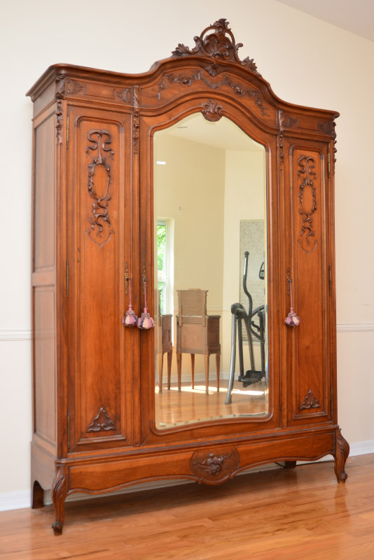 FRENCH ROCOCO STYLE CARVED ARMOIRE: Carved crest with shell & foliate motif, shaped pediment, applied floral decoration all over front. Center door with shaped beveled mirror, interior shelves. Door either side with shelves, hand written Lyon, 1920 inside base, carved front feet, overall measures 102'' h. x 71'' x 22''.