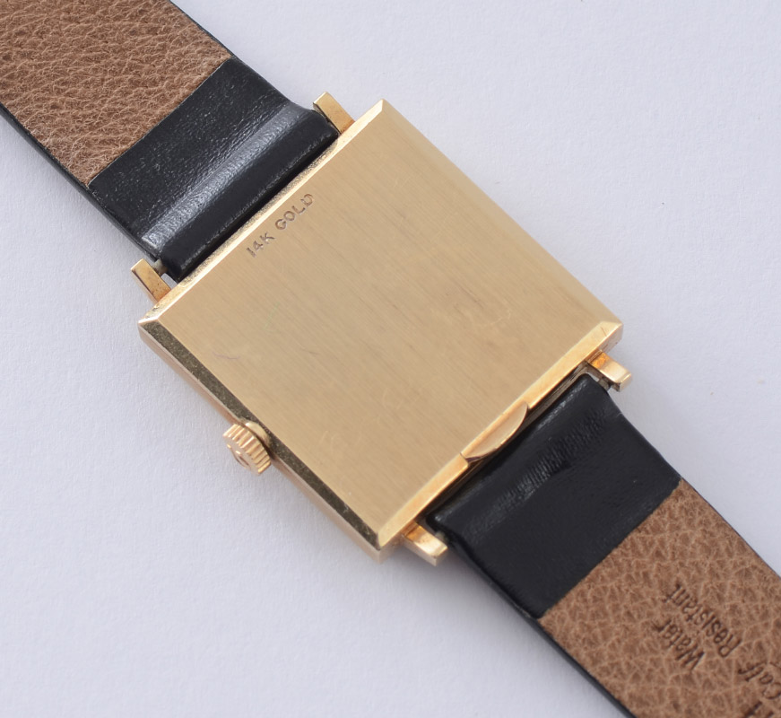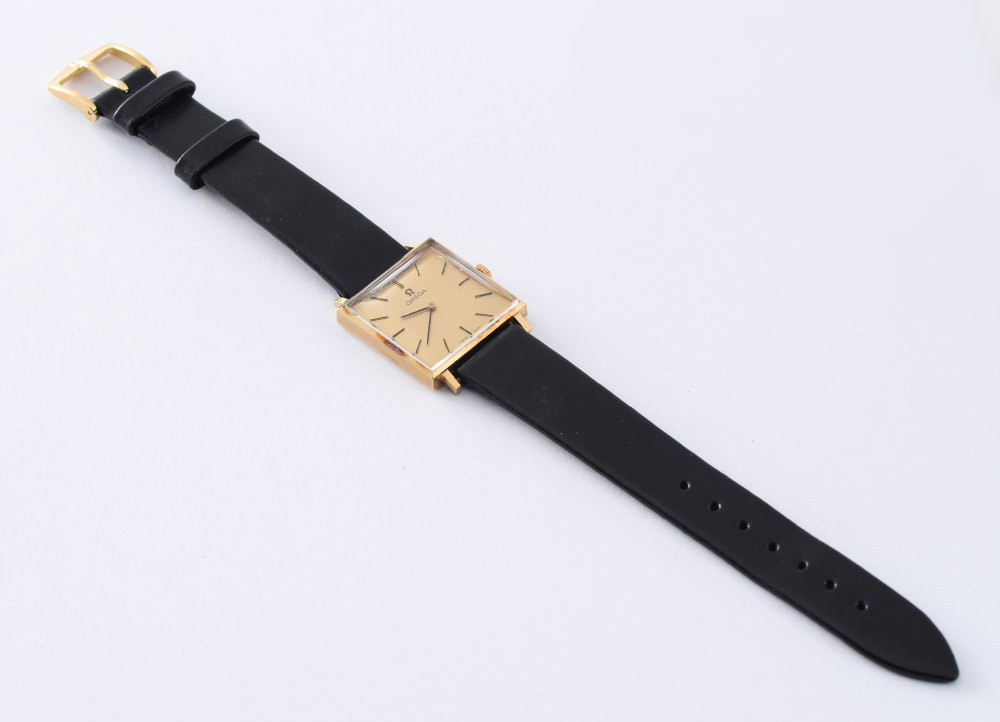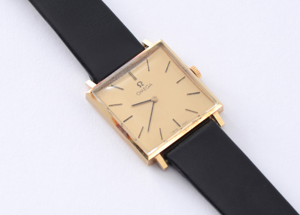 VINTAGE OMEGA 14K GOLD WRIST WATCH: Square dial wrist watch, mat gold dial with polished bar markers, 17 jewel, Swiss movement. Black leather strap. The dial measures 23 mm.