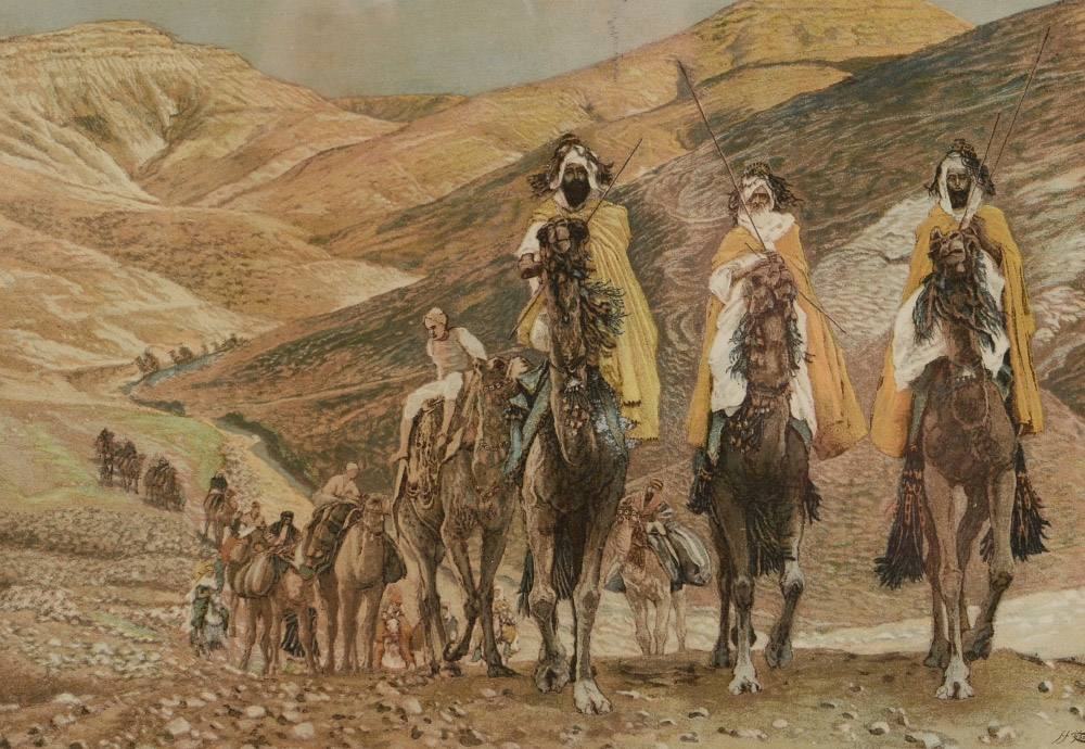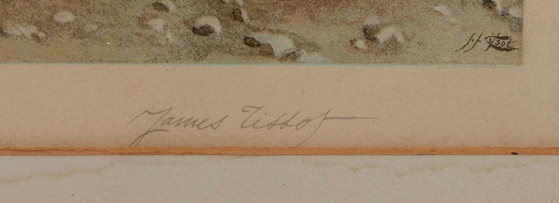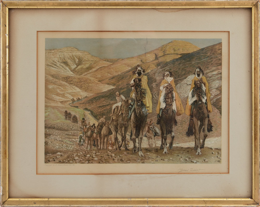 TISSOT, James, (French, 1836-1902): Arab Riders in a Caravan on Camels, Lithograph, sight size 9'' x 12 1/4'', pencil signed lower right, framed, 13'' x 16 1/2''.