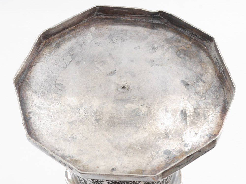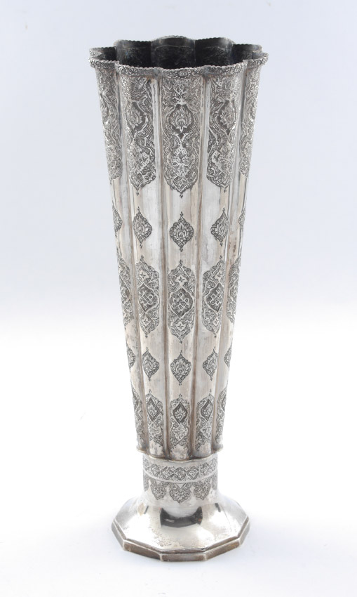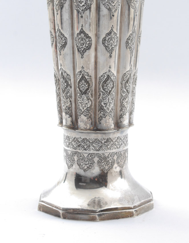 LARGE IRANIAN SILVER EMBOSSED FLUTED VASE: Circa mid 20th century, .875 lion purity mark, fluted body with embossed decoration, overall measures 16'' h. x 5 1/2''. Approx. 35.4 troy oz. Former property of a US Foreign Service Officer living in Post-War China (1945-).